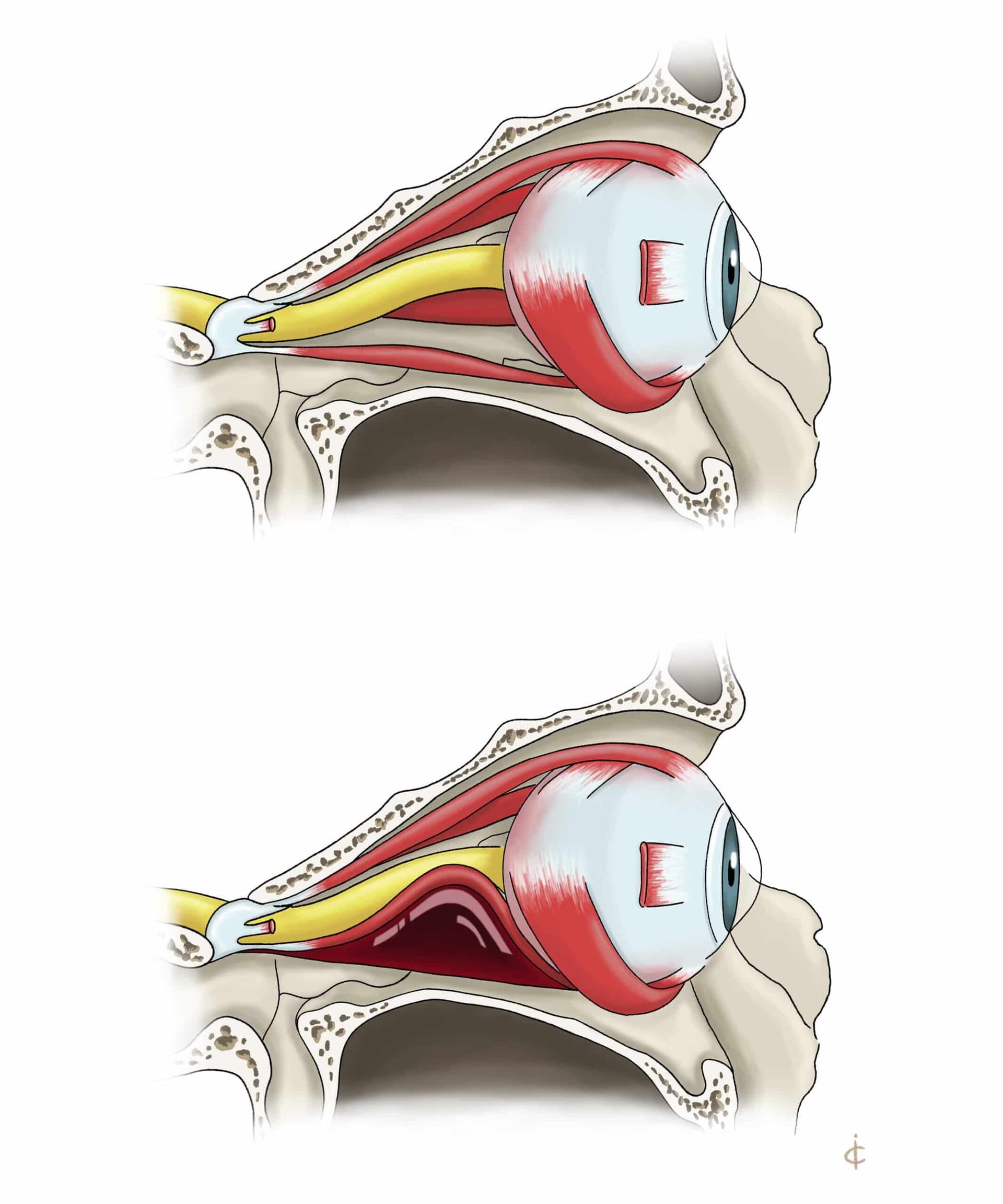 Hemorrhage within the confined orbital cavity can result in elevation of tissue pressures which may lead to decreased vascular perfusion and ischemia of the optic nerve or retina.8 Patients may present with painful proptosis, increased intraocular pressure, ecchymosis of the eyelid, chemosis, decreased visual field, decreased visual acuity, and/or an afferent pupillary defect.6,8 Blindness can become permanent one hour after onset if intraocular pressure is not released.6