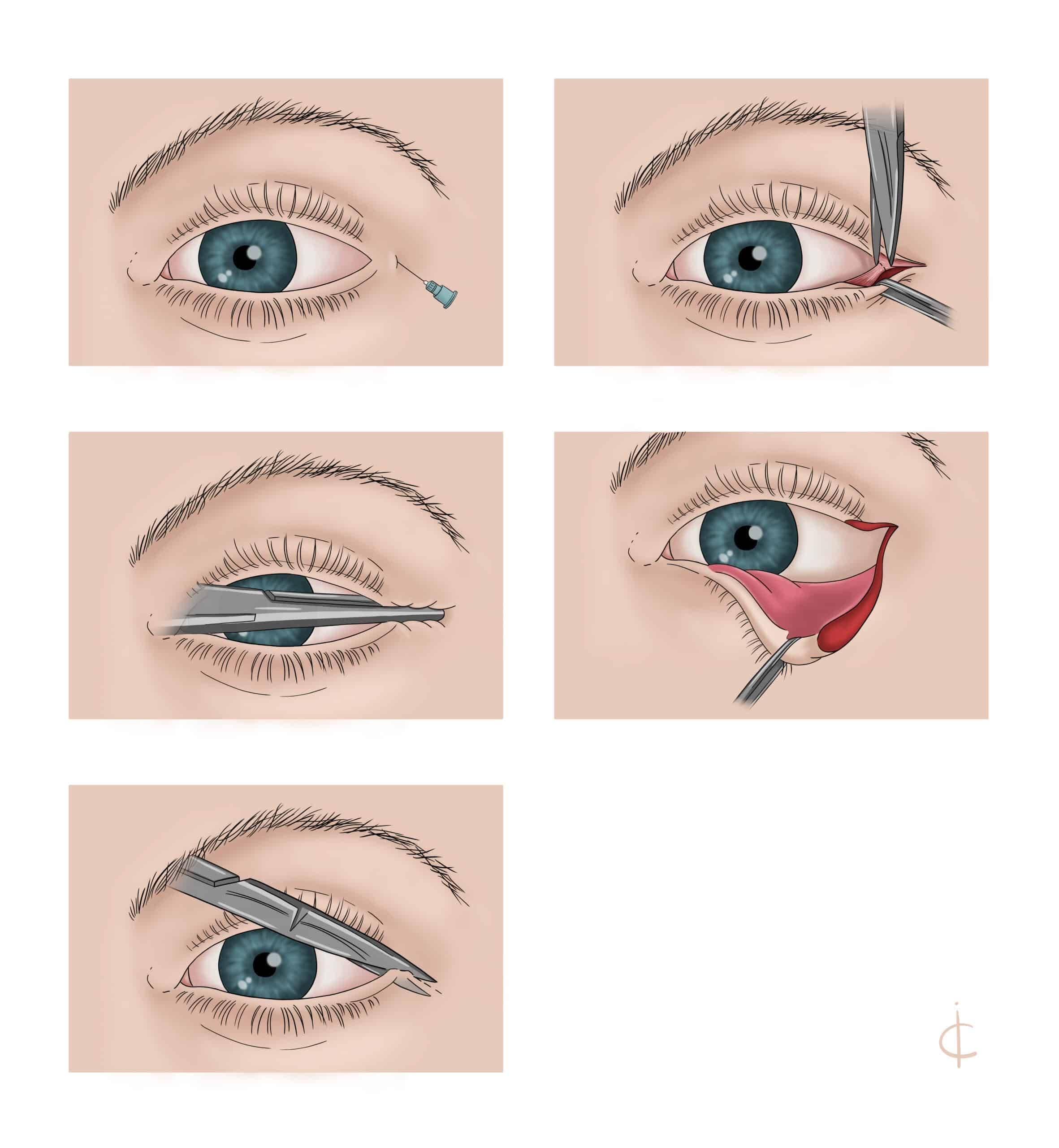 Intervention involves immediate decompression by performing a lateral canthotomy and inferior cantholysis (Figure 2). This can be accomplished at the bedside under local anesthesia. A pointed scissor is inserted horizontally into the outer lid angle laterally so that the instrument contacts the underlying bone of the lateral orbital rim.8 Next, the lateral palpebral fissure is cut horizontally including the skin, the orbicularis oculi muscle, and the conjunctiva.8 Finally, the scissors are introduced through the incision vertically to cut the inferior canthal tendon releasing the lower lid from the lateral orbital wall.7,8 This allows for the globe to prolapse anteriorly and relieves the pressure within the orbit. Large dose systemic corticosteroids and osmotic agents are also apart of established protocols for treatment.8