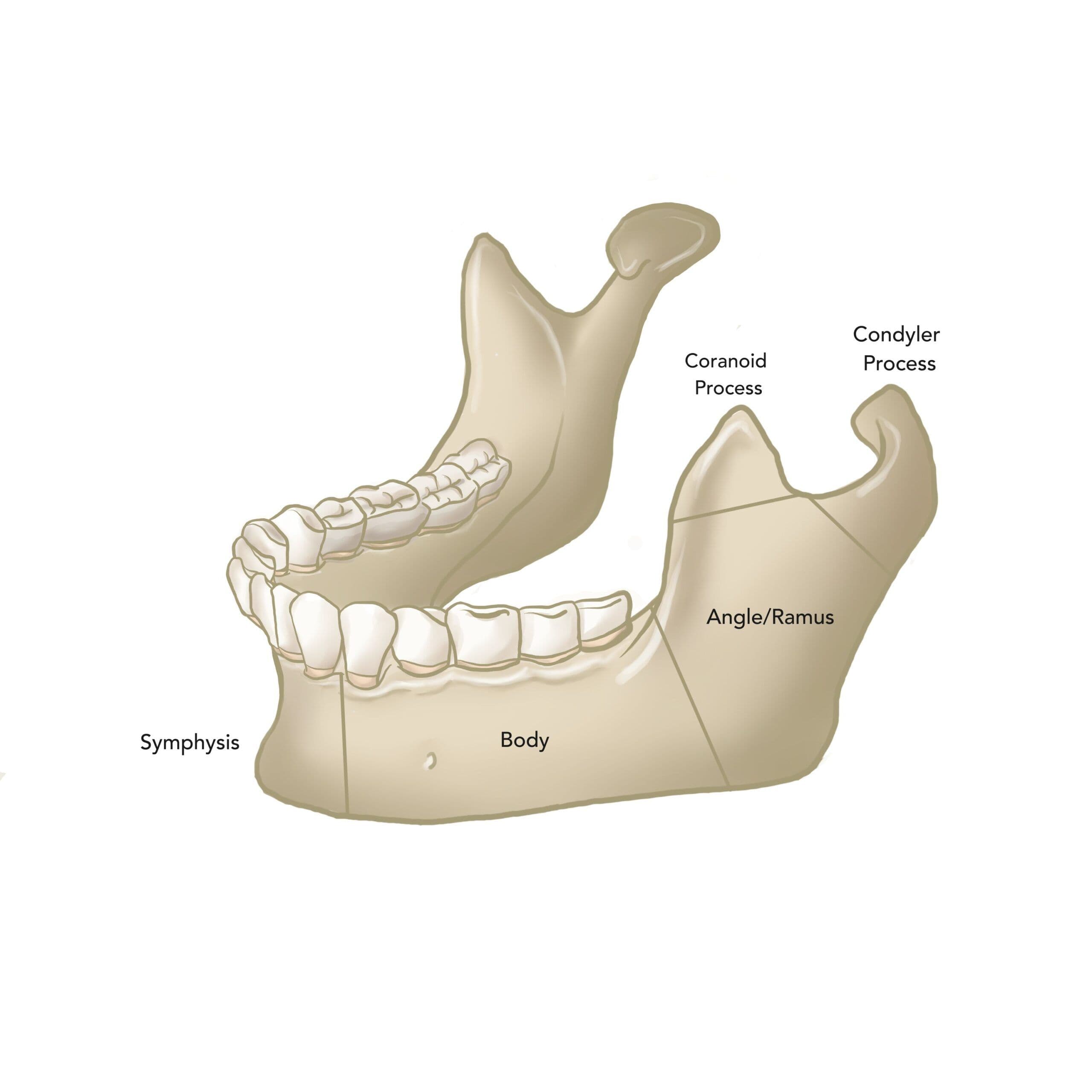 The mandible is divided into distinct anatomic sites that will dictate the necessary treatment.10 Exam findings indicative of fracture include malocclusion, mobility of the tooth bearing segments with bimanual manipulation, preauricular pain, deviation of the mandible on opening, and neurosensory changes in the inferior alveolar nerve (IAN) distribution.6,10 Swelling, hematomas, lacerations, and loose teeth may be helpful in identifying the location of the fracture/s.
