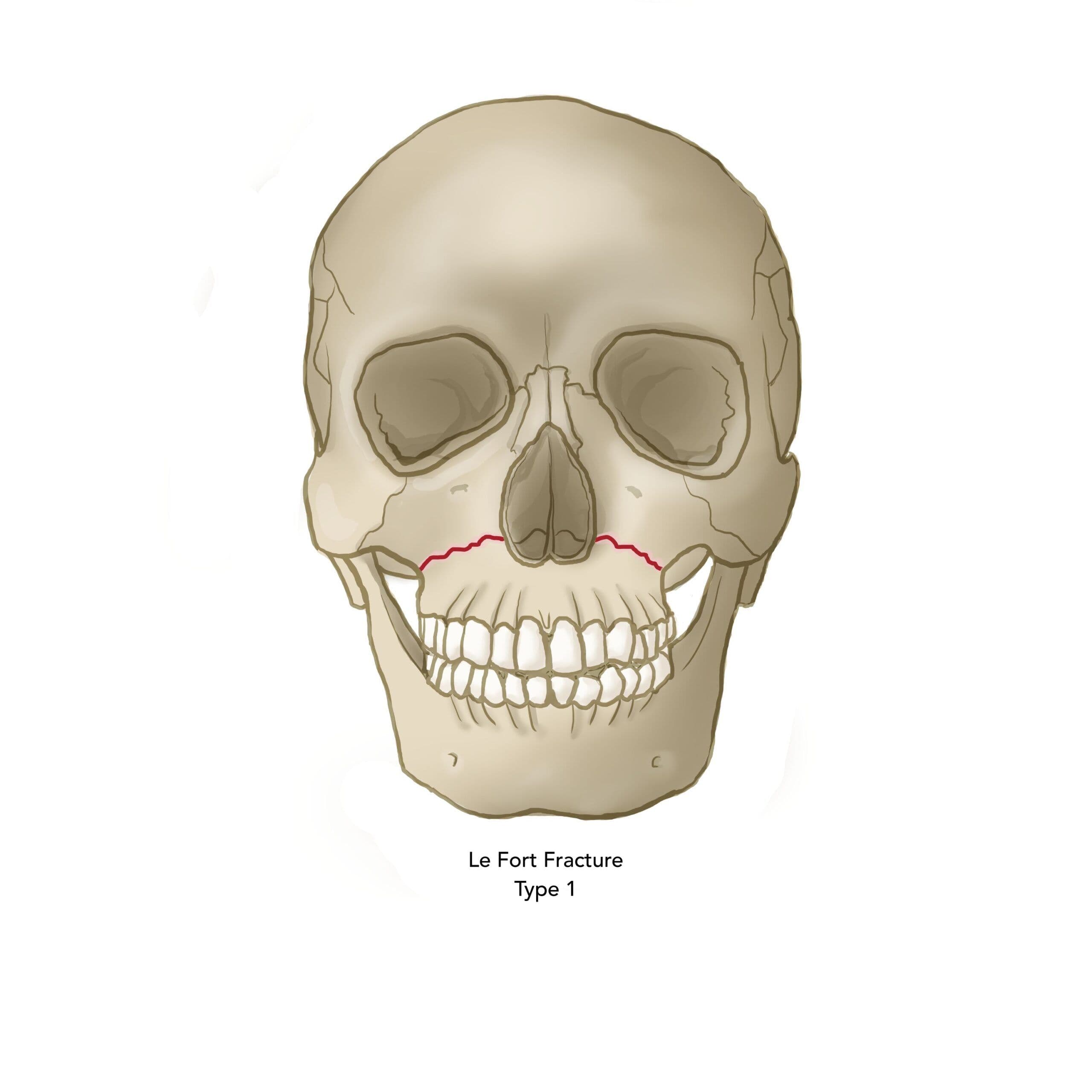 Le Fort I fractures occur at the level of the piriform aperture and involve the anterior and lateral walls of the maxillary sinus, lateral nasal walls, and the pterygoid plates.6 During examination, the maxilla should be grasped with a finger and thumb and pulled in all directions to assess for mobility. The patient may also have malocclusion and hypoesthesia in the area of the infraorbital nerve.
