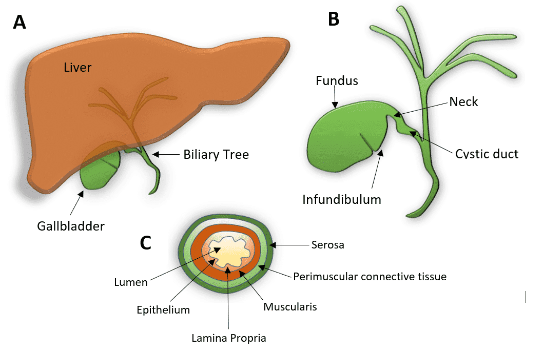 A) Gallbladder beneath the liver, B) Anatomy of the gallbladder and biliary tree, C) Layers of gallbladder wall