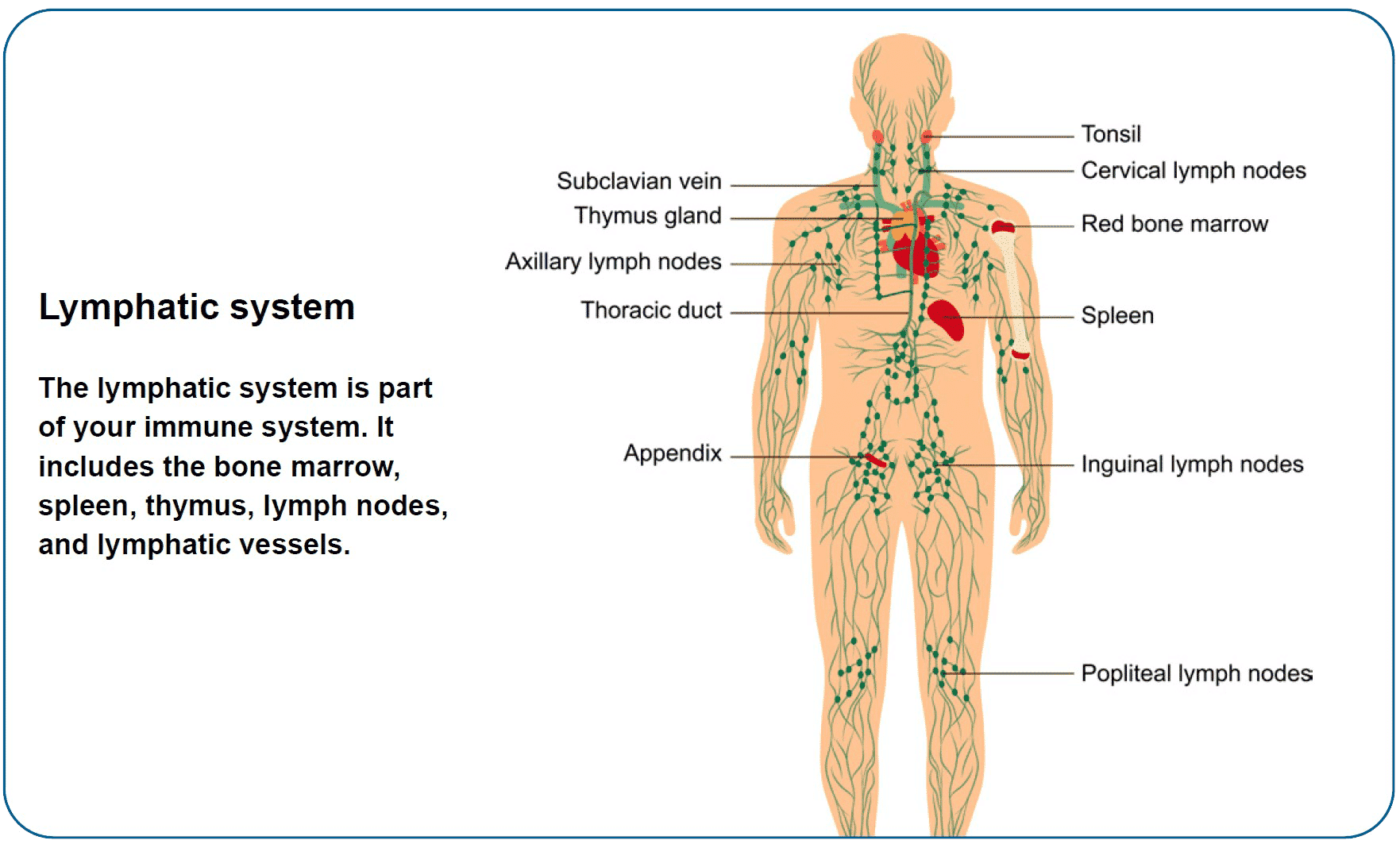 The lymphatic or lymph system is a major part of the body’s immune system. It is a germ-fighting network of tissues and organs that includes the bone marrow, spleen, thymus, lymph nodes, and lymphatic vessels.