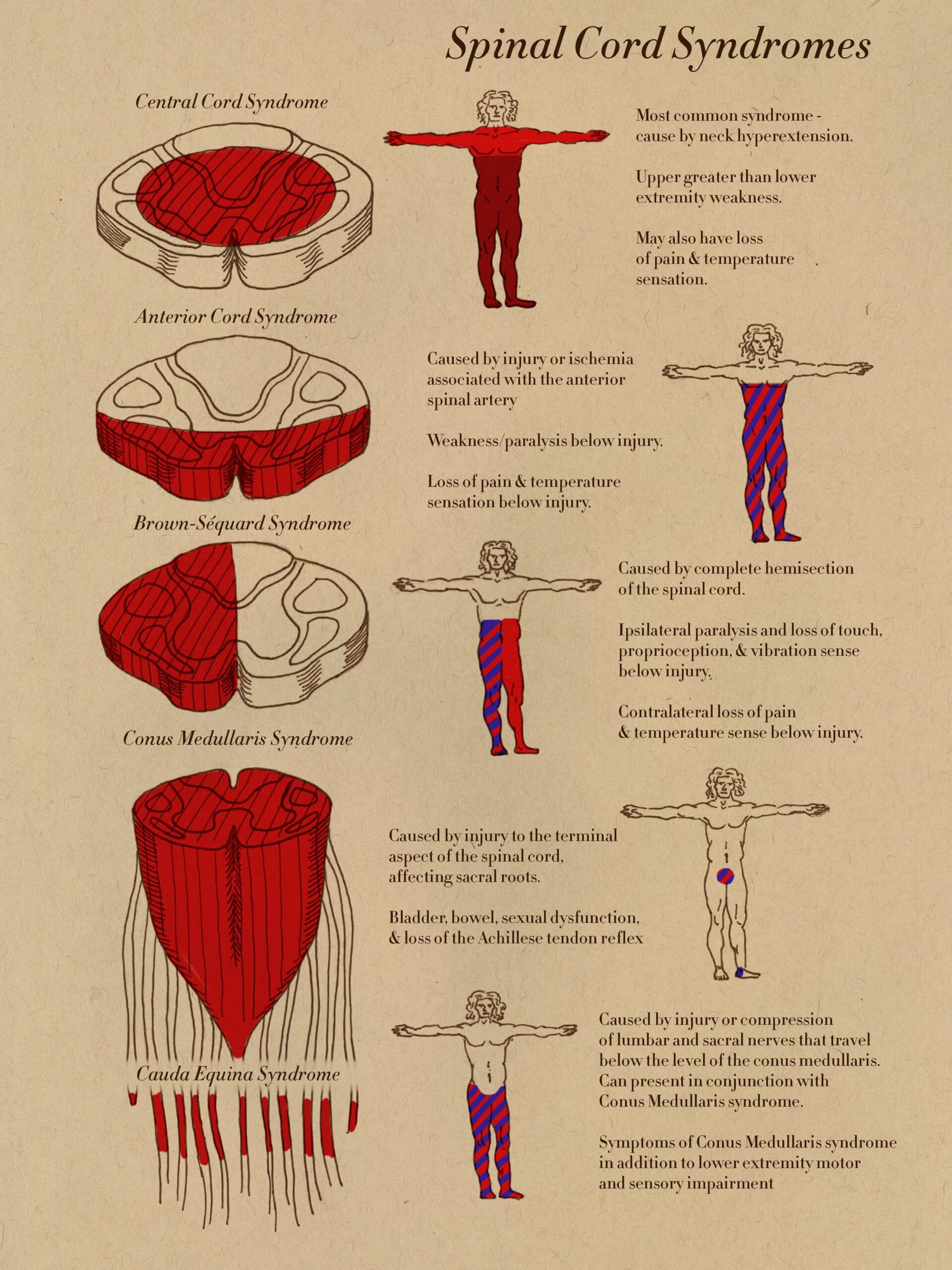 A few specific named spinal cord injury syndromes warrant attention as their clinical presentation can help guide management.