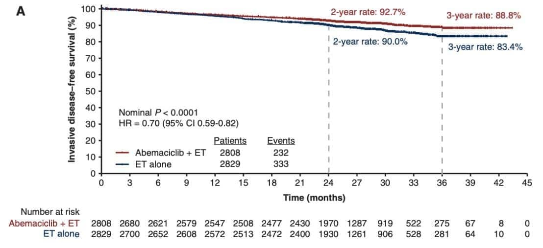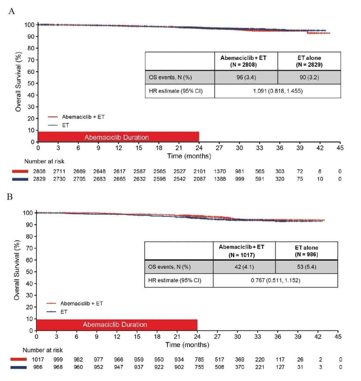 In a letter to the editor published in Annals of Oncology, two OS curves from monarchE were released: OS for the ITT population showed a HR of 1.091 (95%CI 0.818-1.455), with a comparable number of deaths in both study arms (3.4% vs 3.2%), whereas OS in the FDA indicated population (high-risk features, Ki-67 ≥20%) showed a HR of 0.767 (95%CI 0.511 – 1.152), with slightly less deaths in the abemaciclib arm (4.1% vs 5.4%).