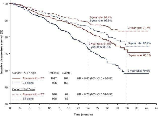 A similar relative reduction in risk of relapse was observed with abemaciclib in the populations of patients with Ki-67-high and Ki-67-low tumors, suggesting no predictive value for this biomarker in the context of monarchE. However, due to the prognostic value of Ki-67, the ultimate absolute benefit in 3-year iDFS differed in the two cohorts, being 7.1% in the Ki-67-high cohort (86.1% vs 79%) and 4.5% in the Ki-67-low population (91.7% vs 87.2%).