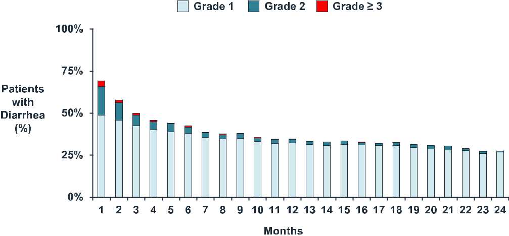 The incidence of diarrhea decreased with time, with virtually no severe events after 6 months of treatment. Despite the occurrence of diarrhea, patient-reported outcomes highlighted no clinically meaningful differences in patients being bothered by treatment side effects between monarchE arms.[11]