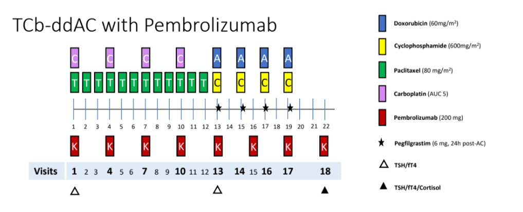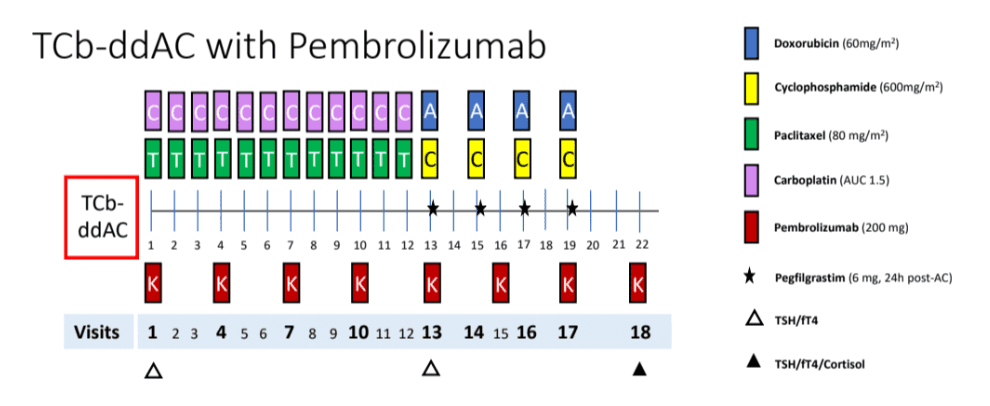 - Carboplatin (Q3W or weekly) + paclitaxel (weekly) + pembrolizumab (Q3W) followed by AC (Q2W) + pembrolizumab (Q3W): TCb-ddAC with pembrolizumab