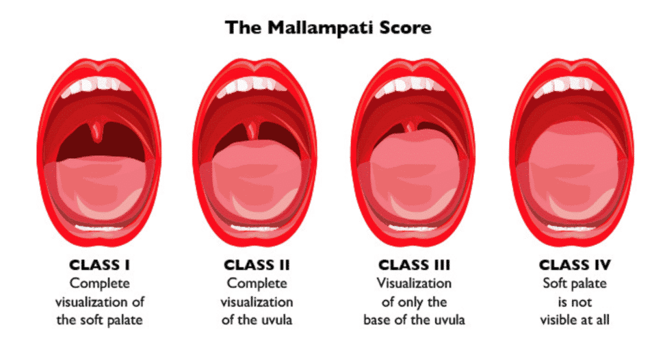 This includes 3-3-2 rule (incisor distance < 3 fingers, hyoid mental distance < 3 fingers, thyroid to mouth < 2 fingers), the Mallampati score (Image I), and neck mobility (is it restricted for any reason including C-collar position, other neck injuries).