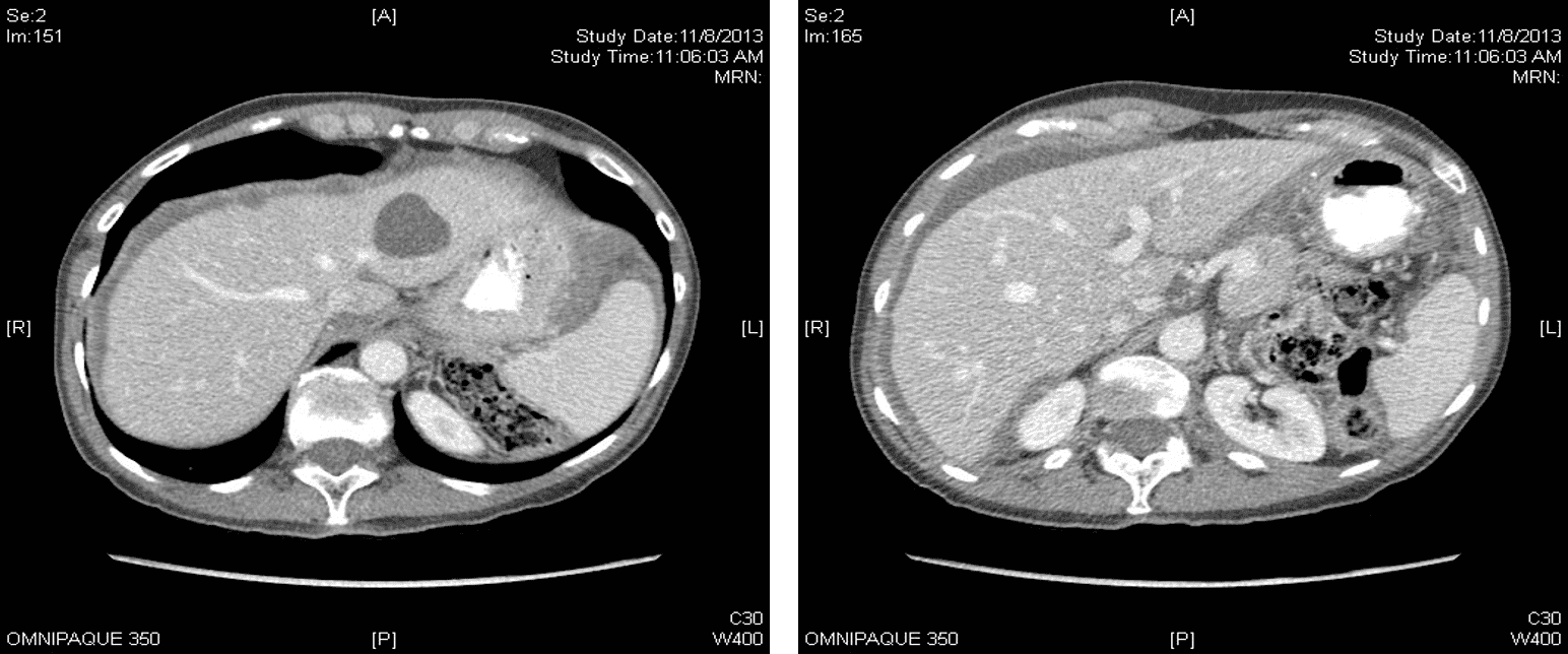 Imaging workup for appendiceal adenocarcinoma may include CT or MRI and selective use of PET/SPECT (single photon emission CT). Tumors of at least 15 mm may demonstrate soft-tissue enhancement or cystic dilation [1]. Partial or complete bowel, urinary, or biliary obstruction may be seen in symptomatic patients and typically signifies high-grade serosal and or mesenteric disease. Diffuse mucinous ascites may be observed with liver scalloping (Fig. 2), a hallmark of mass effect from the mucin, and women may have very large adnexal cystic masses [1]. In addition to identifying specific features, the peritoneal carcinomatosis index (PCI) is an important tool in determining both treatment strategy and prognosis [1].