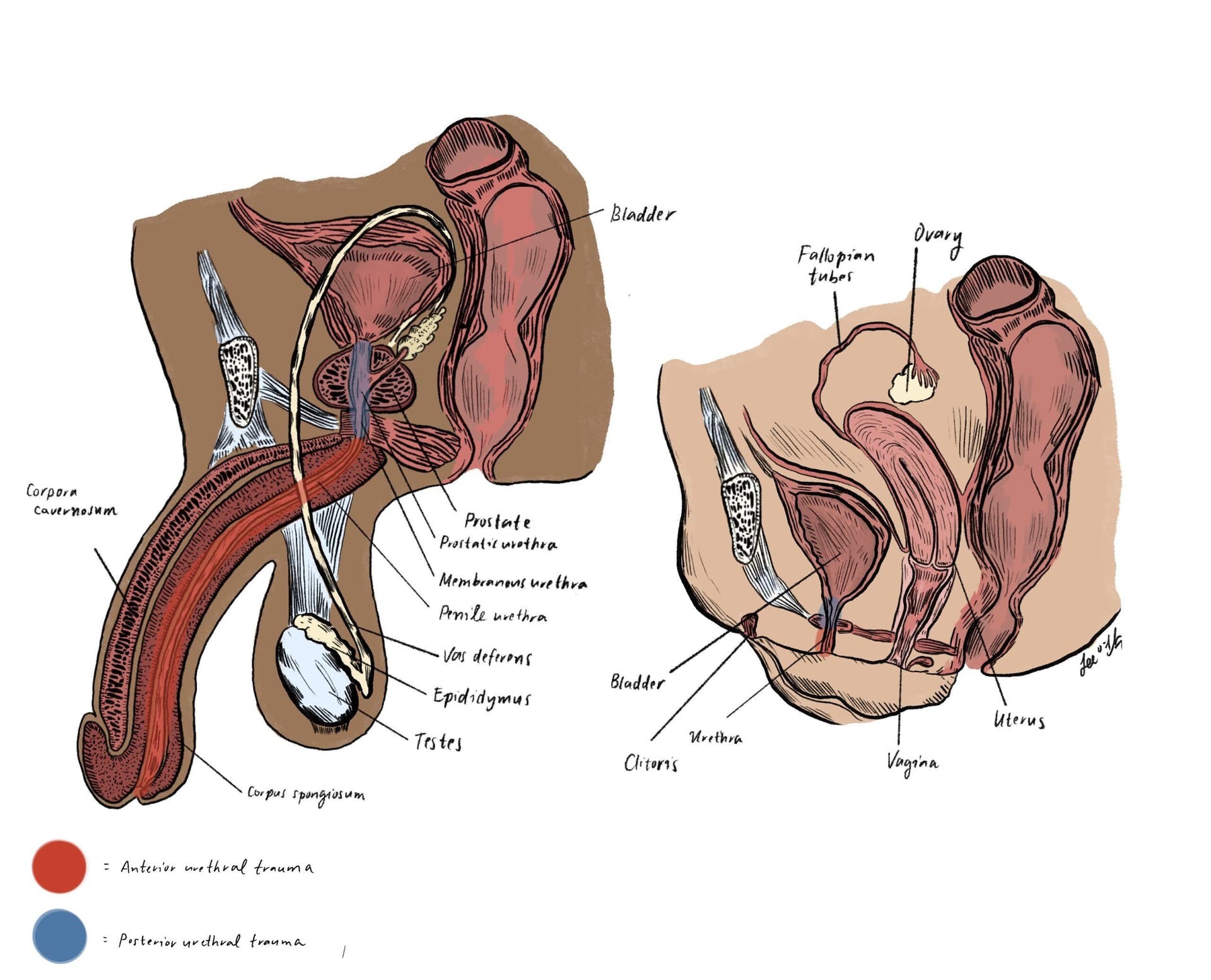 - Injured organs: kidney, ureter, bladder, anterior and posterior urethra, and genitalia