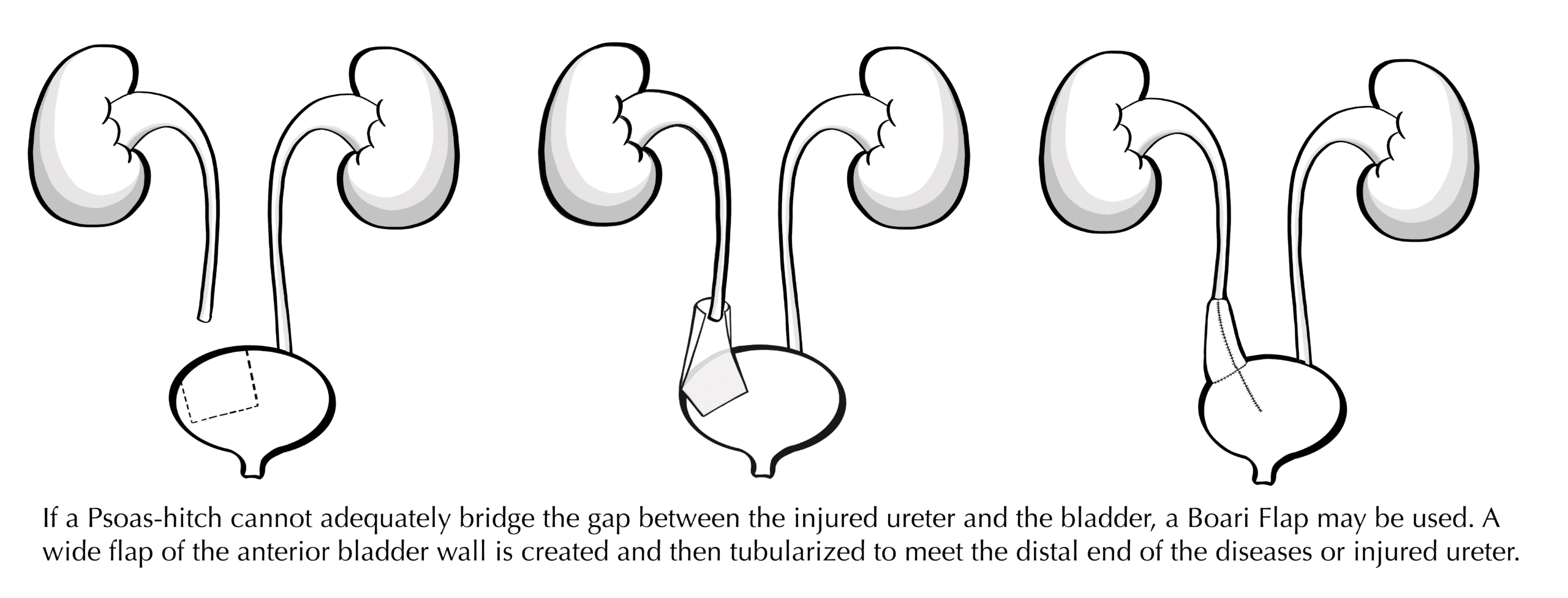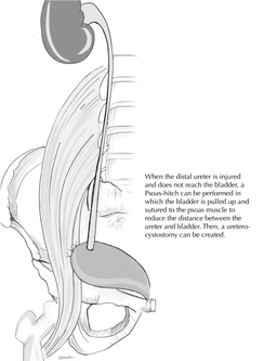 - Distal ureteral injuries of any length are preferably repaired with ureteral reimplantation, which can be performed directly into the bladder or with mobilization of the bladder and fixation of the bladder to ipsilateral psoas tendon (“psoas hitch”). The ureter should be mobilized while preserving vascular supply and spatulated to allow for a widely patent anastomosis, with placement of ureteral stent and foley catheter to facilitate healing.
