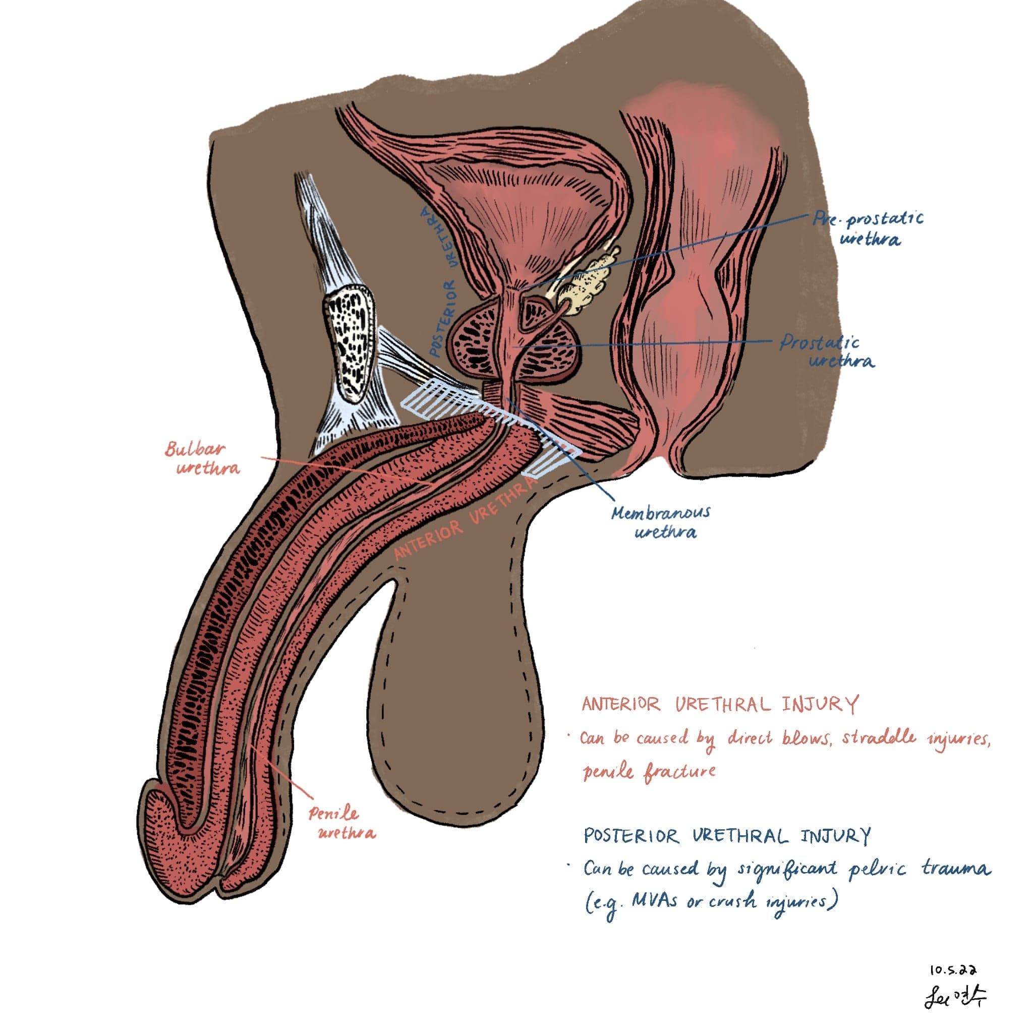 - Posterior Urethral Trauma: Typically coexist with pelvic fracture at bulbomembranous junction. Incomplete urethral tears should be managed with a foley catheter, as no evidence suggests that foley catheter insertion could aggravate the tear. In more extensive injuries, prompt suprapubic cystostomy is recommended to facilitate bladder drainage. Delayed reconstruction is the standard of care and should be performed by a urologist with expertise in urologic reconstruction, a minimum of 3 months after initial trauma.