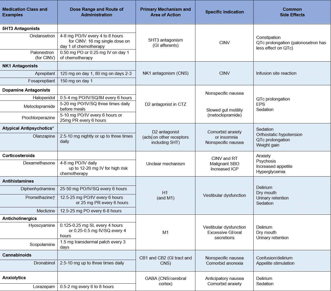 GI = gastrointestinal; CTZ = chemoreceptor trigger zone; CNS = central nervous system. PO = oral; IV = intravenous; SQ = subcutaneous; IM = intramuscular; PR = rectal; SL = sublingual. 5HT3 = 5-hydroxytryptamine (serotonin) 3 receptor; NK1 = neurokinin 1 receptor; D2 = dopamine 2 receptor; H1 = histamine 1 receptor; M1 = muscarinic acetylcholine 1 receptor; CB1 = cannabinoid 1 receptor; CB2 = cannabinoid 2 receptor; GABA = gamma-aminobutyric acid receptor; CINV = chemotherapy induced nausea and vomiting; RT = radiation therapy; SBO = small bowel obstruction; ICP = intracranial pressure; EPS = extrapyramidal symptoms.