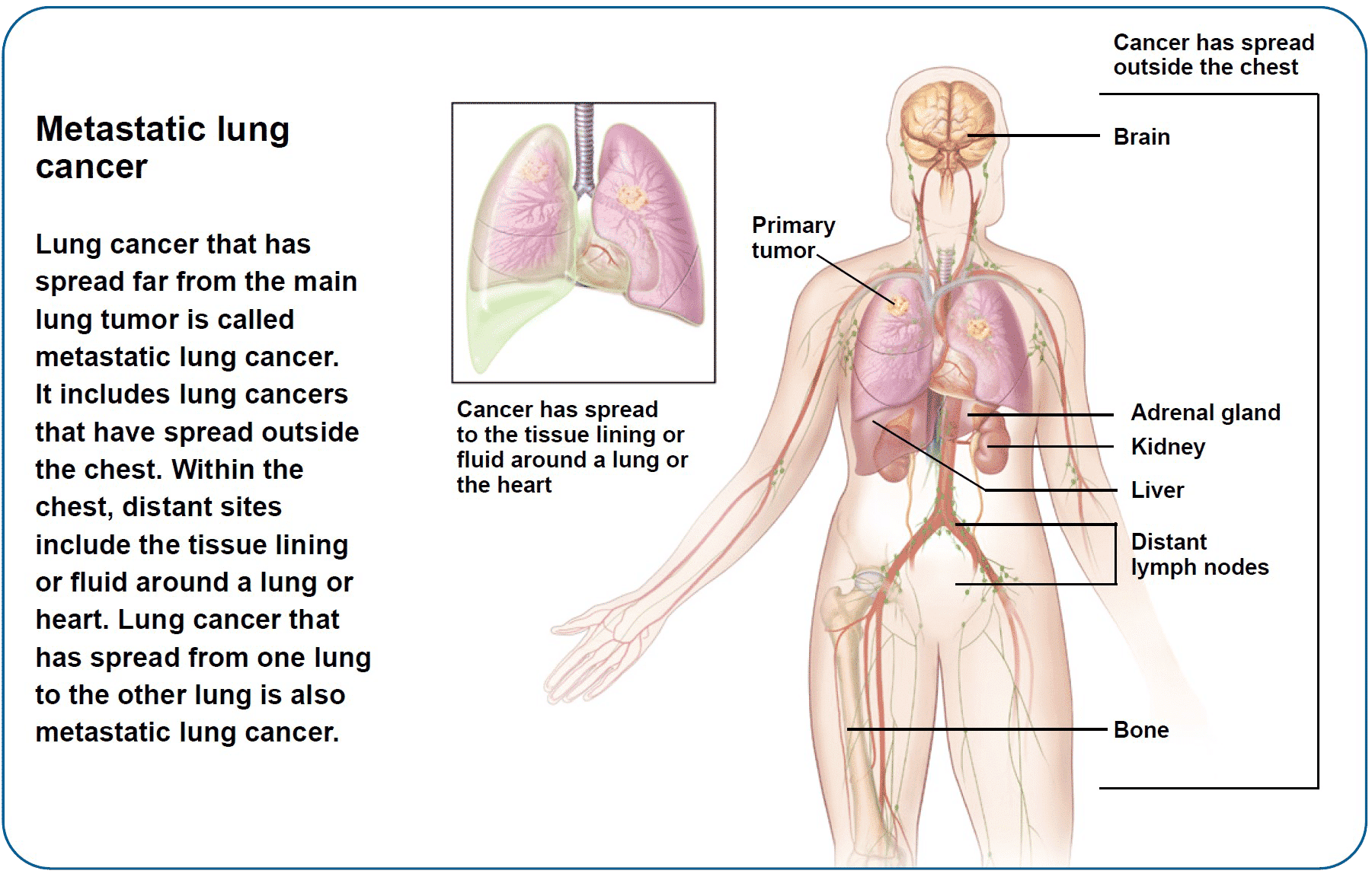 - Metastatic lung cancer has spread far from where it started.