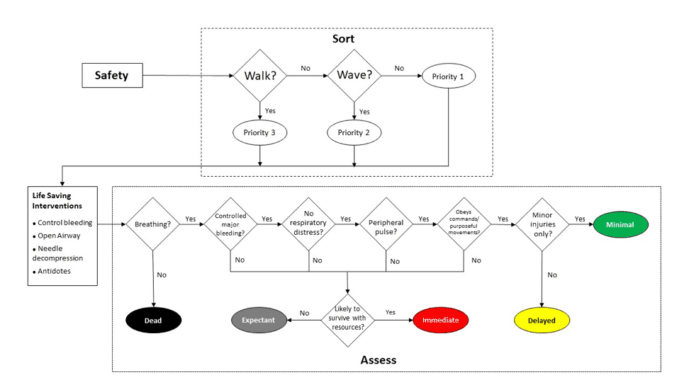There are several steps involved to efficiently and safely triage wounded patients into these categories. These steps are as follows: scene safety, sort, life-saving interventions, assess, and treatment. While these are described as “steps”, depending on available personnel, certain steps may occur simultaneously. For instance, obvious life-saving interventions might be provided while walking wounded are sorted to another location. As mentioned above, good coordination, communication, and practice is required to ensure the process occurs smoothly and efficiently.