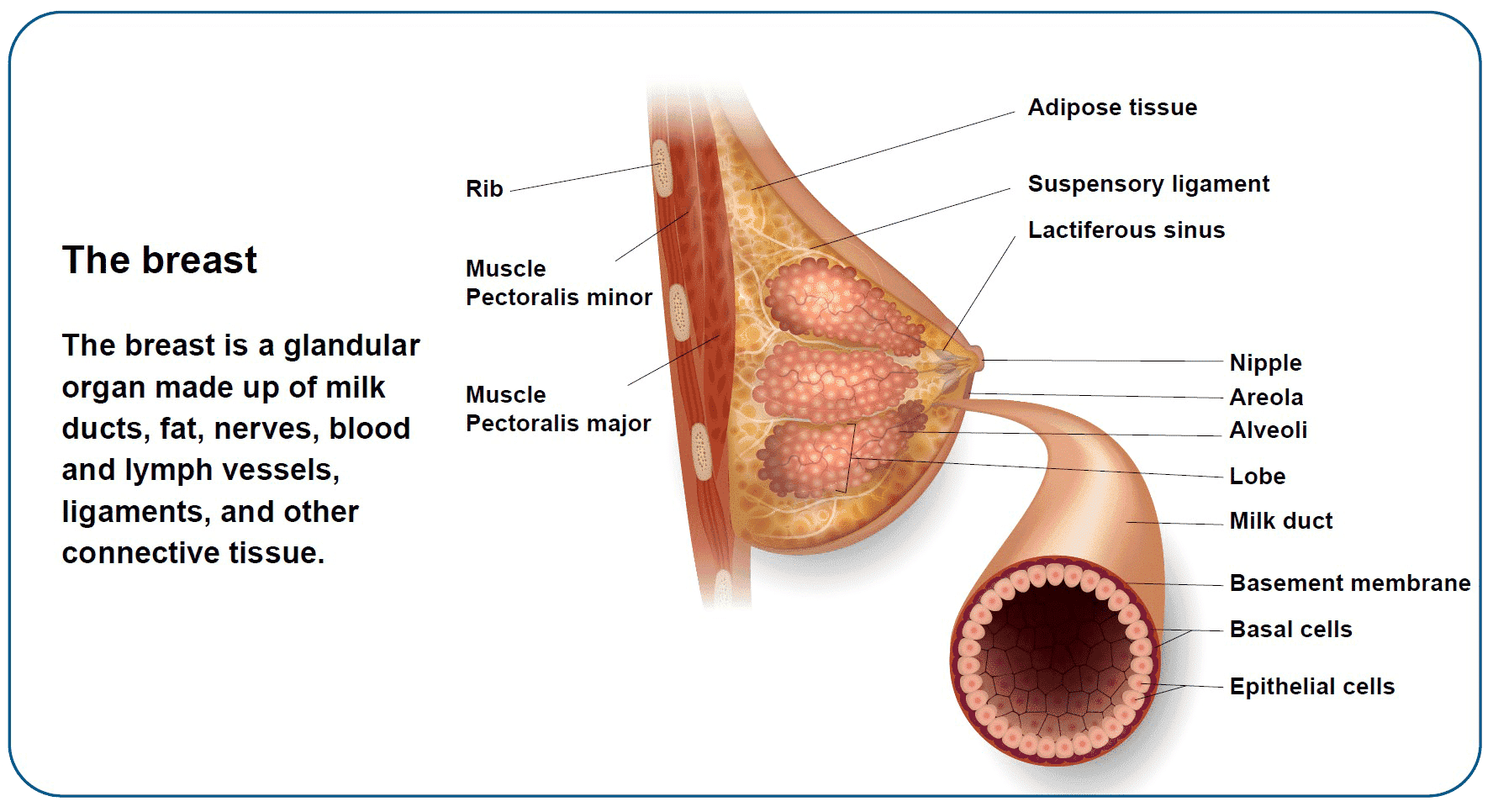 The breast is an organ and a gland found on the chest. The breast is made of milk ducts, fat, nerves, lymph and blood vessels, ligaments, and other connective tissue. Behind the breast is the pectoral (chest) muscle and ribs. Muscle and ligaments help hold the breast in place.
