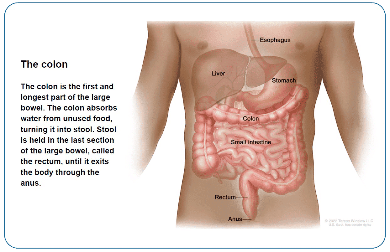 The colon is the longest part of the large intestine, also known as the large bowel. The large bowel is a long tube-shaped organ that forms the last part of the digestive system. The digestive system breaks down food for the body to use.