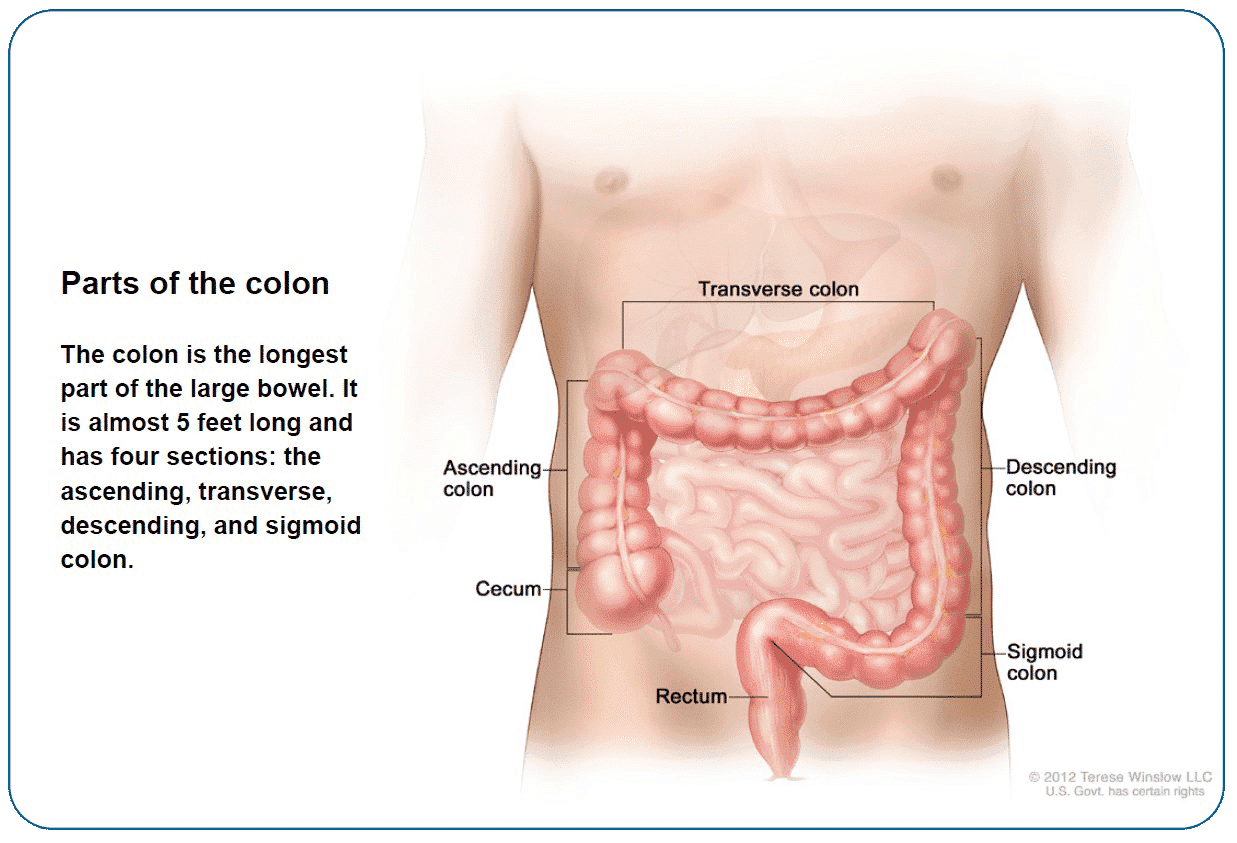 The colon is the first and longest section of the large bowel. It is almost 5 feet long and has four parts: the ascending, transverse, descending, and sigmoid colon.