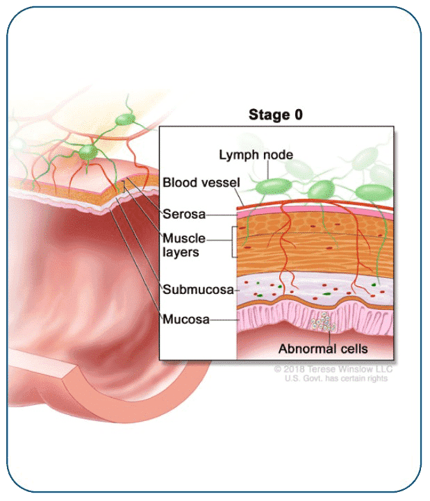 There are abnormal cells on the innermost layer of the colon wall. These abnormal cells may become cancer and spread into deeper layers of the colon wall. Stage 0 colon cancer is also called carcinoma in situ of the colon.