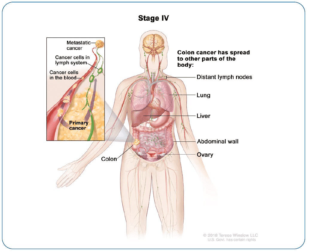 The cancer has spread to areas outside the colon and nearby lymph nodes. Colon cancer spreads most often to the liver and/or lungs.