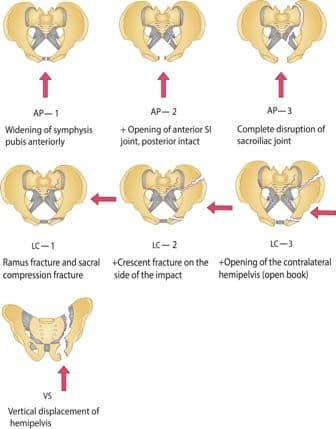 LC2 fractures have an additional crescent or iliac wing fracture in the posterior pelvis. LC3 fractures are known as “wind-swept” pelvis, with fracture-dislocations causing internal rotation of one hemipelvis and external rotation of the contralateral hemipelvis. These injuries present with the greatest mechanical instability and pelvic hemorrhage and require immediate intervention with pelvic binder placement.