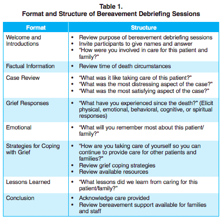 Formal debriefing techniques can occur on a regular or ad hoc basis and varies on work setting, clinician capacity to dedicate time, and individuals involved. The pediatric palliative care program of the Johns Hopkins Children’s Center developed a bereavement debriefing session for healthcare professionals.