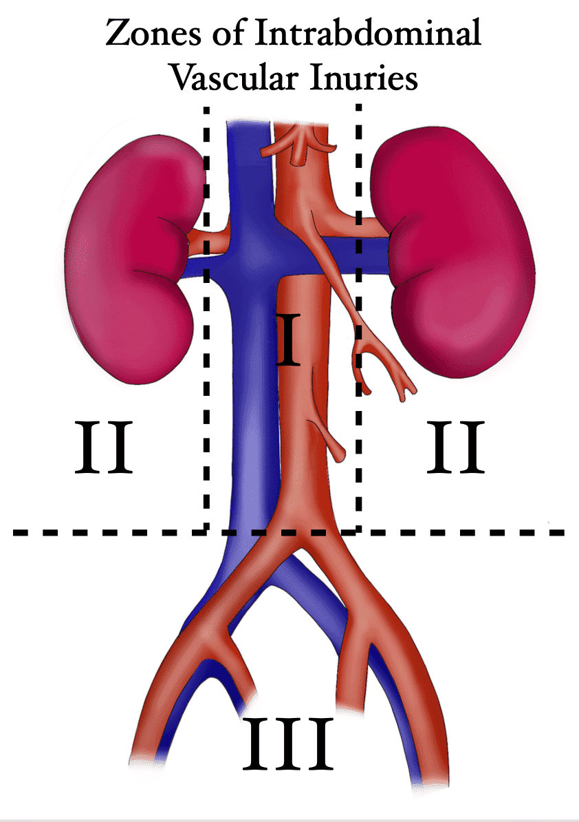 - Zone 1 comprises the midline retroperitoneum from the aortic hiatus of the diaphragm to the sacral promontory, including the aorta, inferior vena cava (IVC), and proximal visceral vessels.