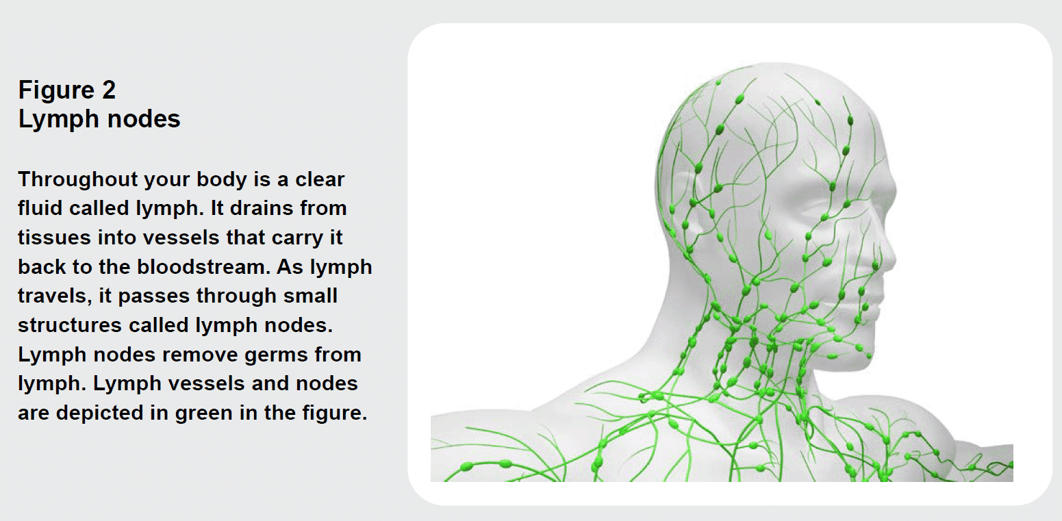As lymph travels, it passes through lymph tissue. Lymph tissue removes germs from lymph. Lymph nodes are small structures that contain lymph tissue. They are found throughout the body. There are many lymph nodes in the left and right sides of the neck. See Figure 2.