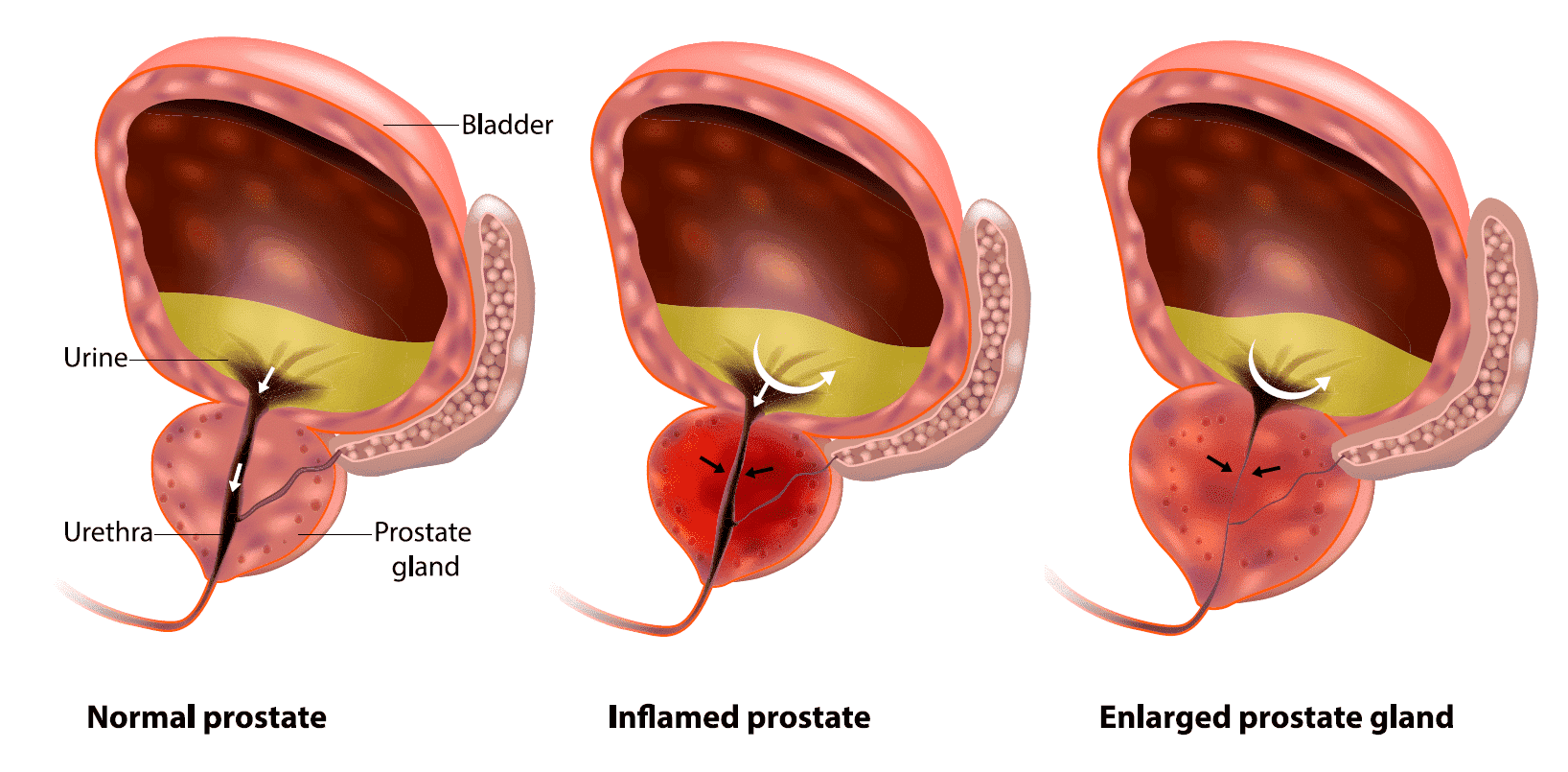 | A young man’s prostate is said to be the size of a walnut or a ping-pong ball and weigh about the same as an AA battery. As you grow older, your prostate gradually grows larger, possibly reaching the size of a lemon or an orange. Having an enlarged prostate is a condition called benign prostatic hyperplasia (BPH). Benign means it’s not cancerous. An enlarged prostate doesn’t cause prostate cancer or increase your risk of getting it. However, it’s common to have an enlarged prostate and prostate cancer at the same time. Notably, an enlarged prostate can cause the same symptoms as those caused by prostate cancer. Doctors aren’t sure what causes the prostate to grow as men get older. A common theory is that levels of hormones (like testosterone) change with age, which affects the size of the prostate. In many individuals, the prostate grows large enough to squeeze the urethra — a tube that passes through the prostate. The urethra allows urine to flow out of the bladder. This squeezing can narrow the urethra, which slows down or stops the flow of urine when you try to pee. Although prostate cancer usually doesn’t cause any symptoms, it also can slow the flow of urine if it grows large enough. That’s why it’s important to get these problems checked out. |