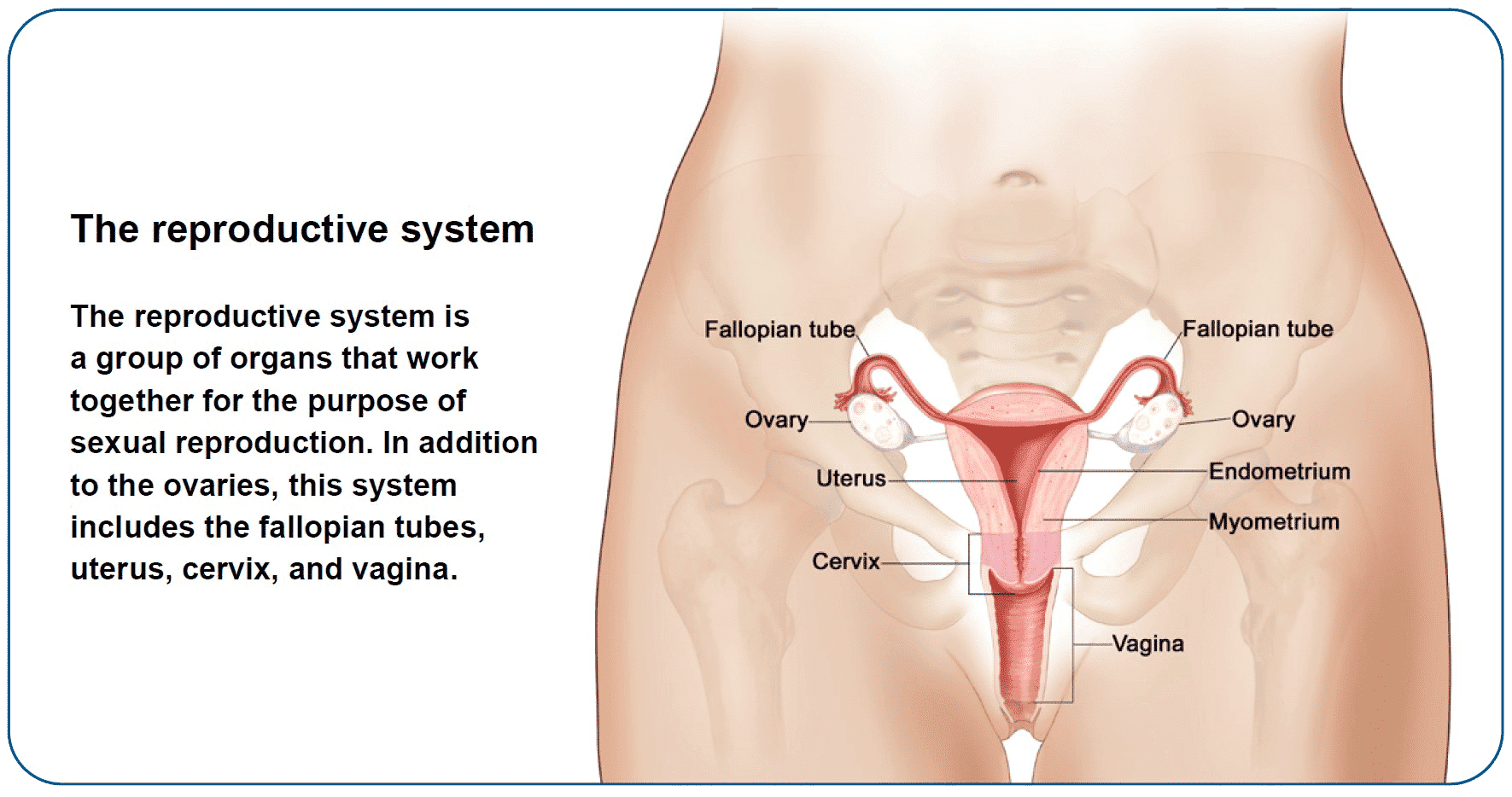 The reproductive system is the group of organs that work together for the purpose of sexual reproduction. In addition to the ovaries, this system includes the fallopian tubes, uterus, cervix, and vagina.