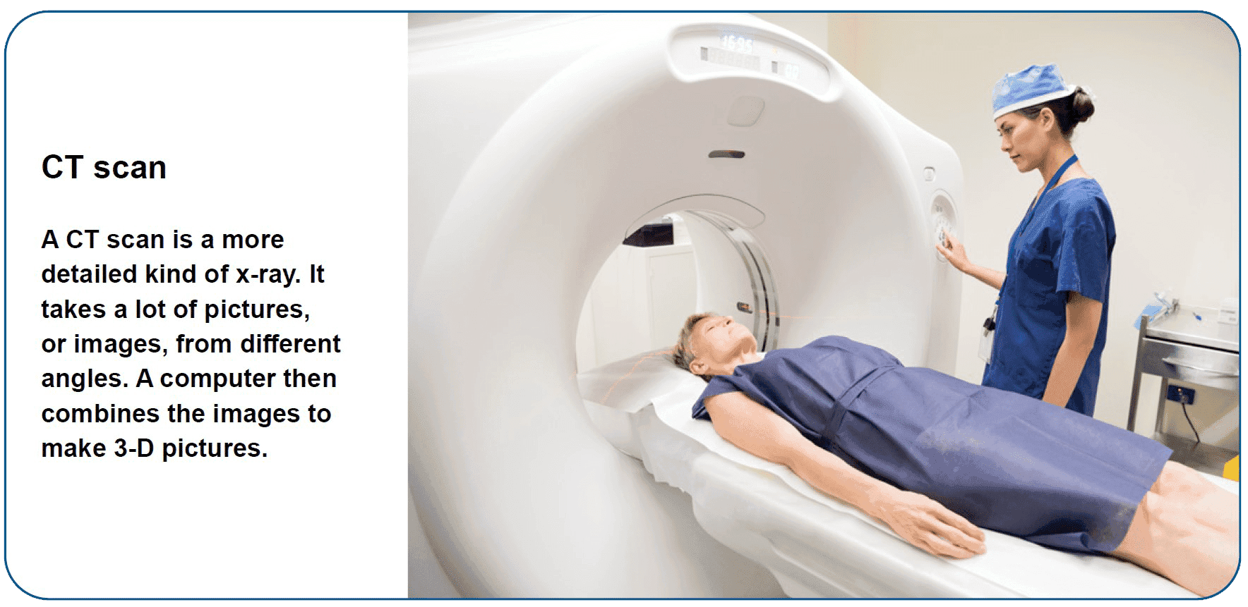 A CT scan uses x-rays to take many pictures of areas inside of the body from different angles. All of the x-ray pictures are combined to make one detailed picture of the body part.