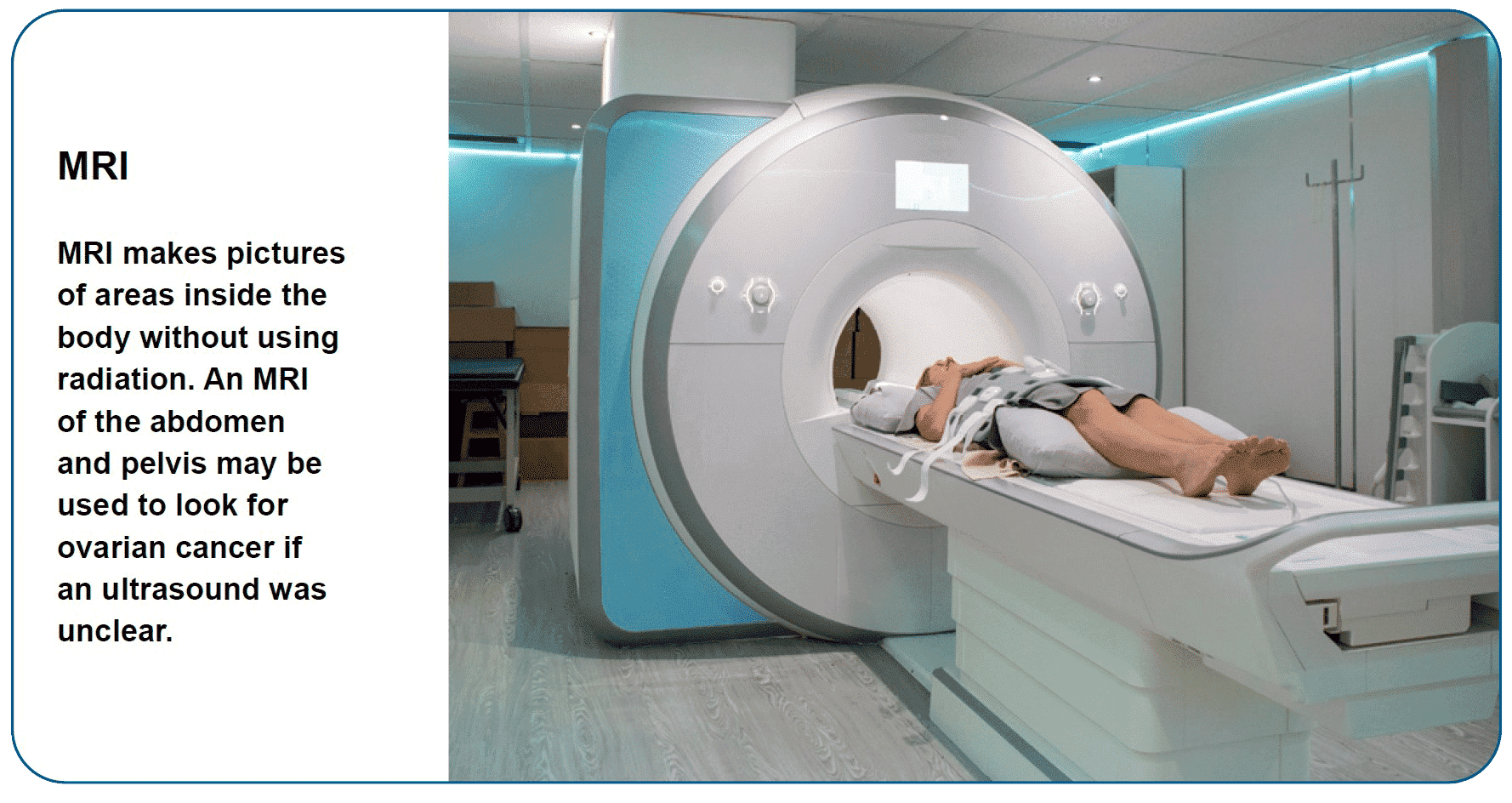 An MRI scan uses radio waves and powerful magnets to take pictures of the inside of the body. It does not use radiation. This type of scan is good at showing the spine and soft tissues. An MRI scan of your abdomen and pelvis may be used to look for ovarian cancer if the ultrasound was unclear. An MRI scan of your chest may be used to look for signs of cancer spread. This test may also be used to check treatment results and to assess for cancer spread to other parts of the body.