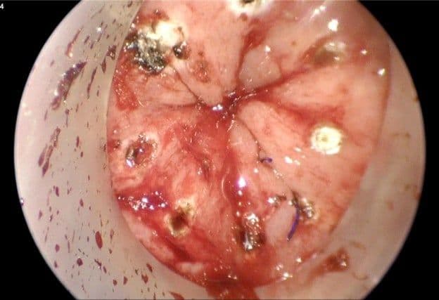 Urethral injury in male patients has been recognized as a particular intraoperative complication in TaTME. There is a slight, but real, increase incidence of urethral injury, particularly at the post-prostatic urethra. Risk factors include surgeon inexperience, anteriorly located tumors, previous pelvic radiation, and patients with prostatic hypertrophy or history of prostatectomy.[14]