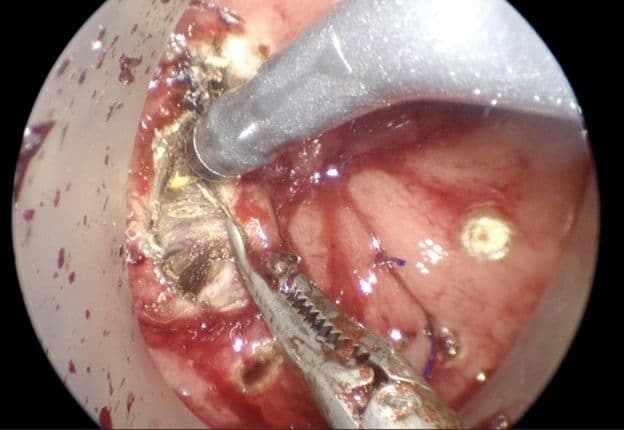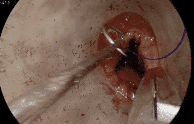 The TME dissection plane is circumferentially continued proximally until the abdominal dissection plane is met, anteriorly at the cul de sac. The TME dissection is completed circumferentially by incising the remaining peritoneal attachments between the abdominal and perineal fields in a coordinated manner, best accomplished with the two surgical teams working in parallel.