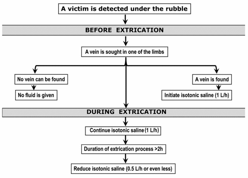 Extrication for crush injury patients can be a prolonged process. A hallmark of crush injury management is to begin resuscitation while the limb or body part is still trapped. This dilutes the toxic byproducts of devitalized muscle tissue when they are released into systemic circulation upon removal of the crushing force.