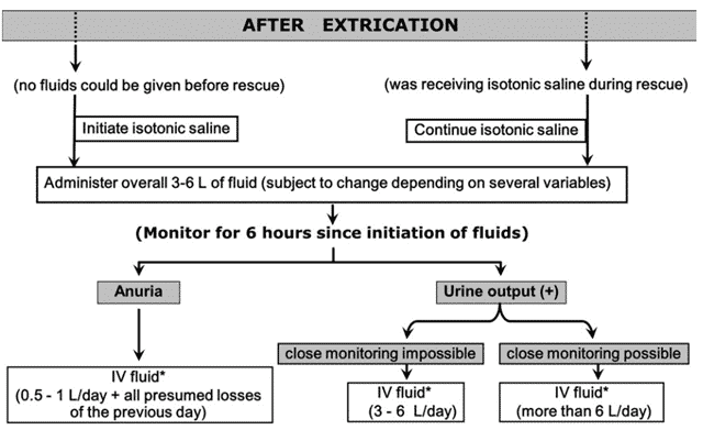 Fluid resuscitation should continue until there is clinical and biochemical resolution of myoglobinuria, usually about 3 days after injury [15,21,22]. The rate of infusion should be guided by clinical response. Isotonic saline is the first choice for fluid during resuscitation. See Figure 2 [22], an algorithm to guide post-extrication resuscitation. Blood products may needed to treat dilutional anemia, and should be administered with Plasma, red blood cells (RBCs), and platelets in a balanced ratio.
