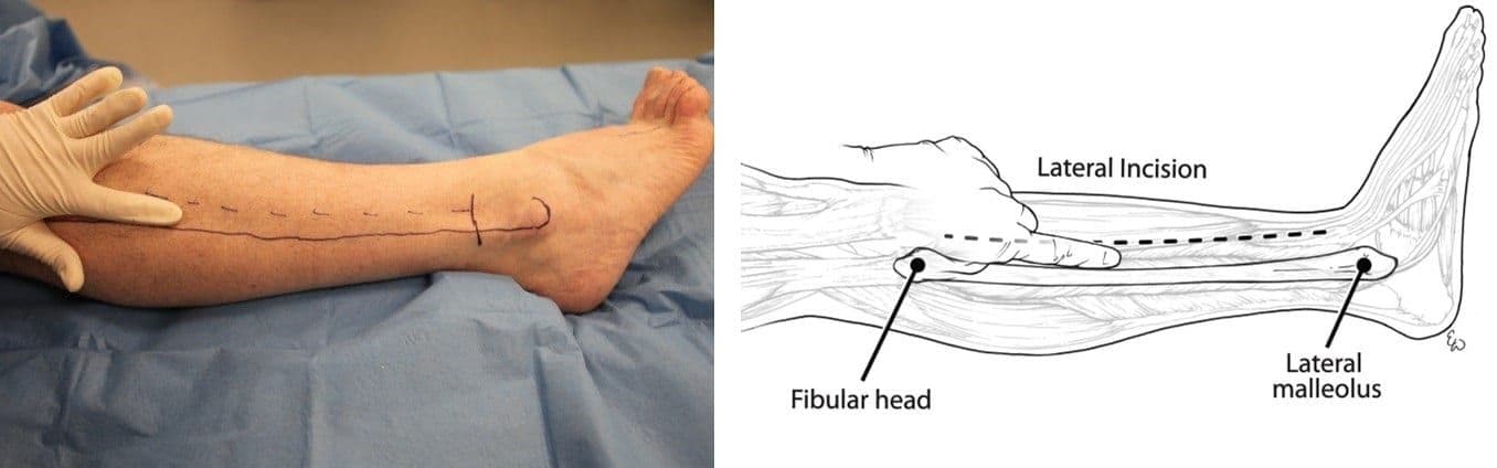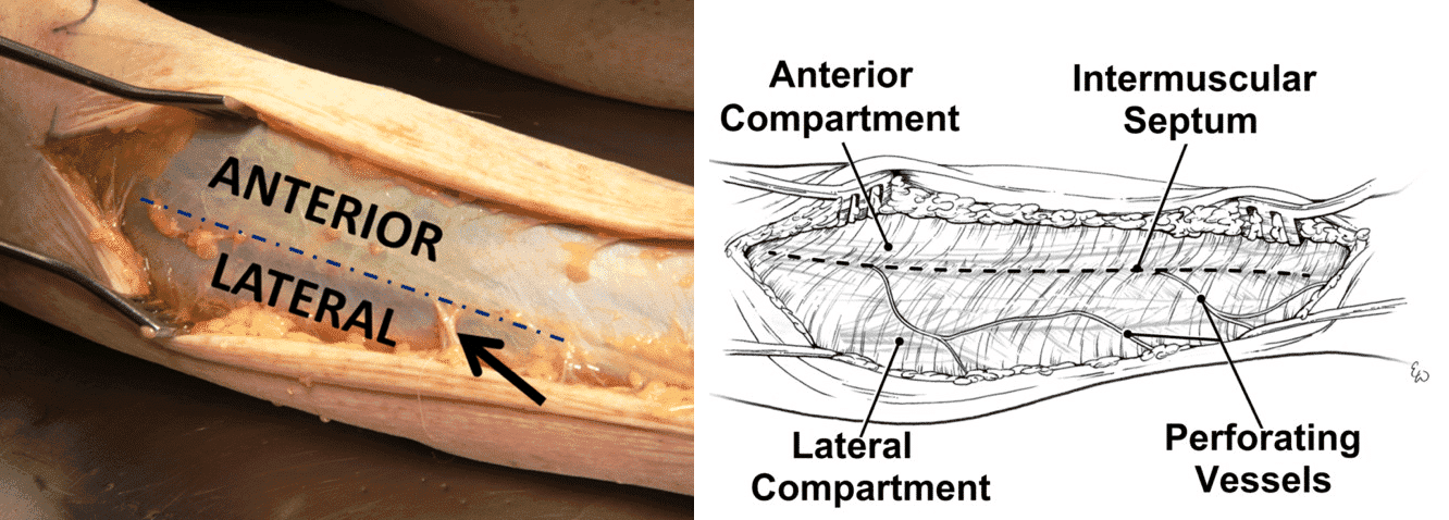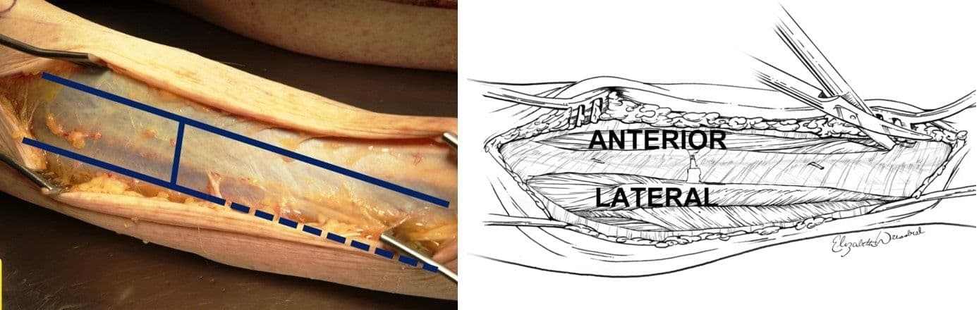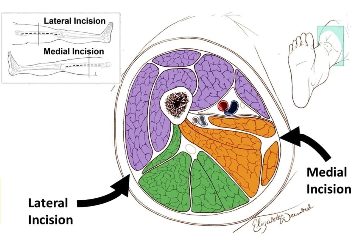 Other clinical signs and symptoms of compartment syndrome include severe progressive pain often “out of proportion” to the clinical situation, and firmness and decreased compressibility of compartments. Paresthesia develops later, while paralysis and pulselessness are considered late findings of compartment syndrome [31], and indicate a dire clinical diagnosis. Patients may have nerve damage and therefore may actually have an absence of severe pain, or may be sedated and unable to report pain, so maintaining vigilance for the development of compartment syndrome is imperative, and early aggressive intervention must be considered. Fasciotomy guidance can be found in Figure 3-19, shared with permission, all medical illustrations by Ms. Elizabeth Weissbrod, MA, CMI [32].