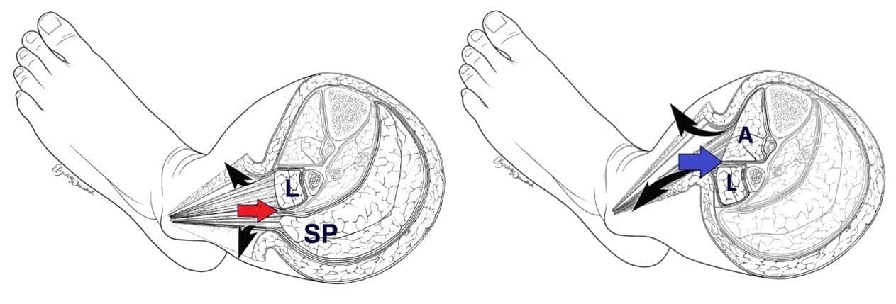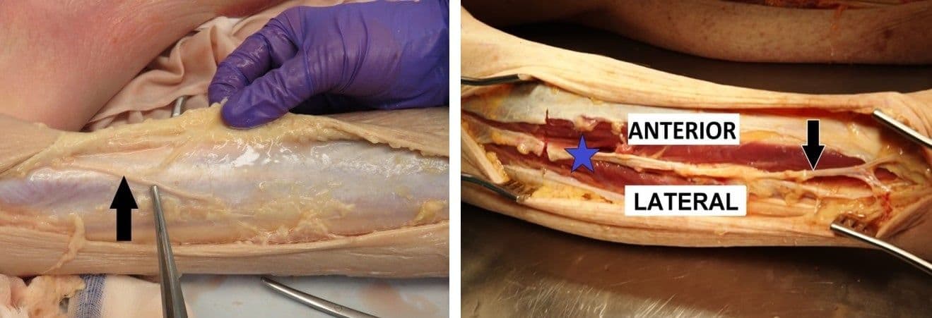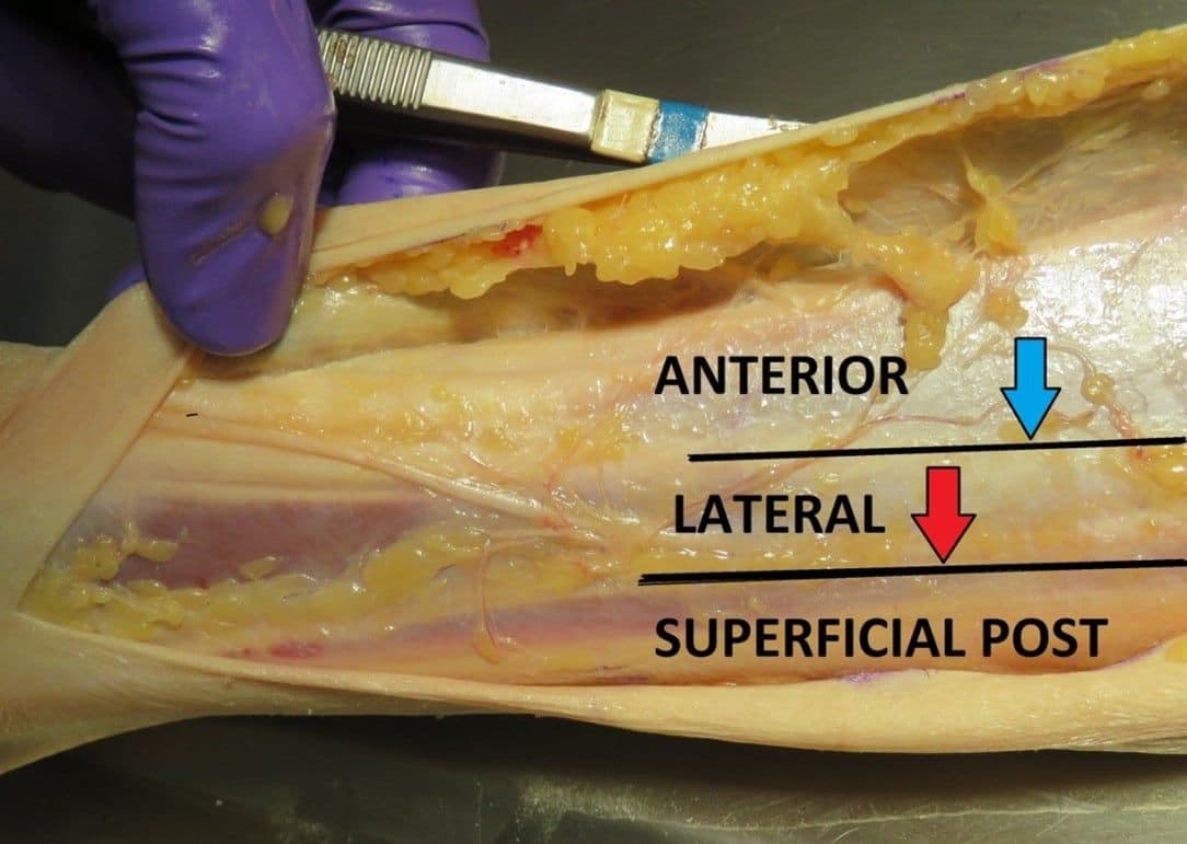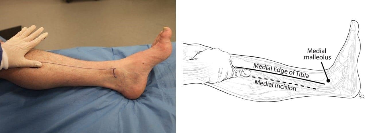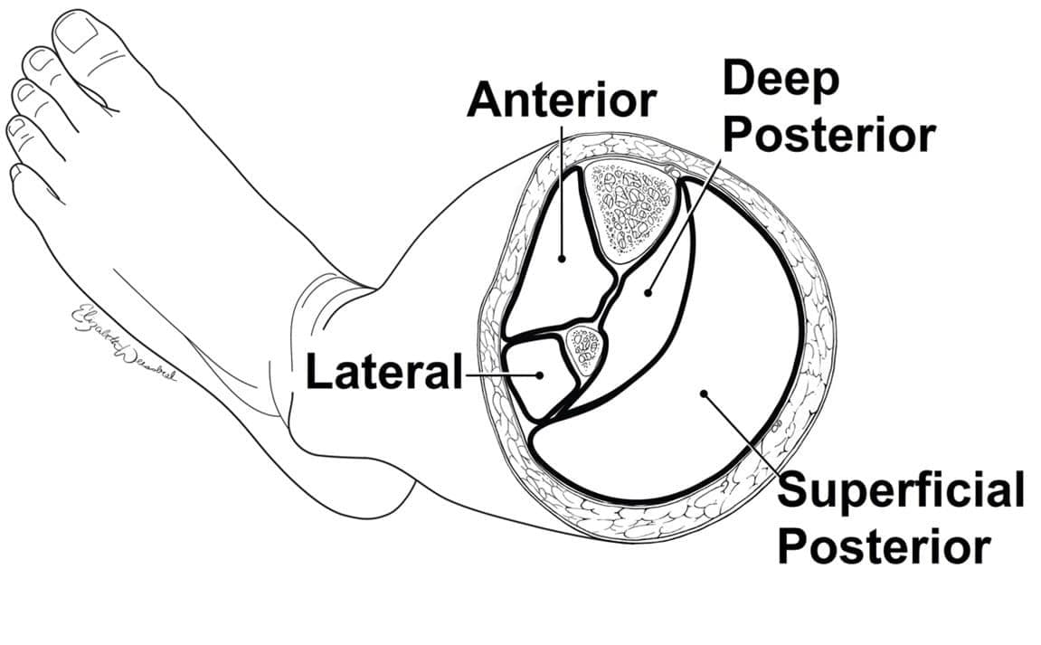Other clinical signs and symptoms of compartment syndrome include severe progressive pain often “out of proportion” to the clinical situation, and firmness and decreased compressibility of compartments. Paresthesia develops later, while paralysis and pulselessness are considered late findings of compartment syndrome [31], and indicate a dire clinical diagnosis. Patients may have nerve damage and therefore may actually have an absence of severe pain, or may be sedated and unable to report pain, so maintaining vigilance for the development of compartment syndrome is imperative, and early aggressive intervention must be considered. Fasciotomy guidance can be found in Figure 3-19, shared with permission, all medical illustrations by Ms. Elizabeth Weissbrod, MA, CMI [32].