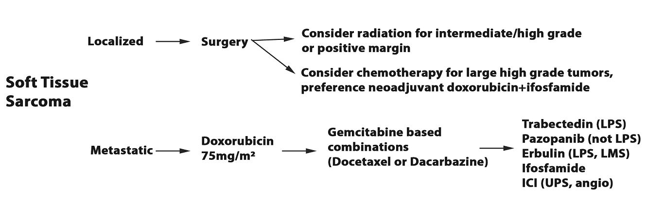 Anthracycline remains the first systemic therapy of choice for most metastatic soft tissue sarcoma, with preferred subsequent lines of therapy evolving as newer data is becoming more and more subtype specific.