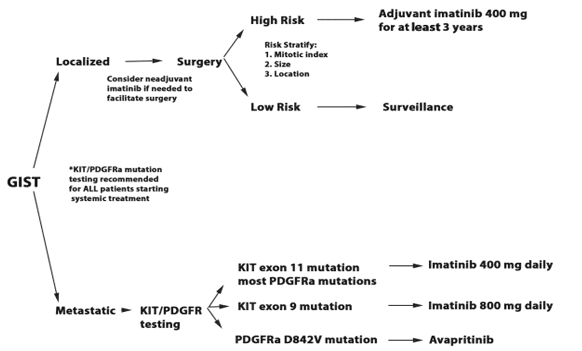 When technically possible, KIT and PDGFR-alpha mutations testing should be performed on all patients for whom systemic therapy with a TKI is being considered. 80% of patients will have a mutation in KIT, with the most common primary driver mutations in KIT exon 11, followed by KIT exon 9 mutations. Notably, patients with a KIT exon 9 mutation require a higher daily dose of imatinib – 800 mg daily. 10% of patients will have mutations in PDGFR-alpha, most of which are also sensitive to 400 mg imatinib. However, it is now recognized that some mutations in PDGFR-alpha exon 18 (especially D842V) confer resistance to imatinib. Several TKIs were developed to have activity against this mutation, and now avapritinib is approved in the United States for upfront treatment of unresectable or metastatic PDGFR-alpha exon 18 mutated GIST due to an overall response rate of 86% in this population [24].