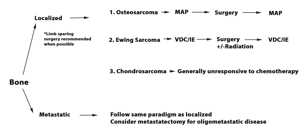 Unlike soft tissue sarcoma, the bone sarcomas osteosarcoma and Ewing sarcoma are systemic diseases and multi-agent chemotherapy is required for all patients regardless of extent of disease at presentation.