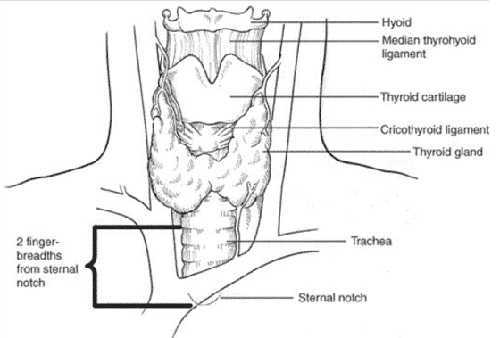 - Palpate the trachea two fingerbreadths above the sternal notch (Figure 1).