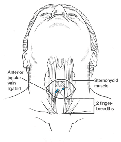 - Bernstein ML, Wang SC. Chapter 45. Tracheostomy and Emergency Cricothyroidotomy. In: Minter RM, Doherty GM. Eds. Current Procedures: Surgery. Ann Arbor, Michigan. McGraw Hill; 2010.