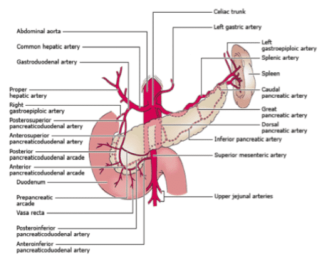 The duodenum is approximately 25 to 30 cm long and is divided into four segments. The first segment, or duodenal bulb, connects to the undersurface of the liver via the hepatoduodenal ligament. The second segment courses around the pancreatic head in a “C” shape and contains the major papilla which, most commonly, drains both the pancreatic and bile ducts. The third segment runs from right to left and posterior to the superior mesenteric artery and vein. Finally, the fourth segment exits the retroperitoneum and continues as the jejunum. The proximal segment of the duodenum is supplied by the gastroduodenal artery and its branches which include the superior pancreaticoduodenal artery [Figure 1]. The distal segment of the duodenum is supplied by the superior mesenteric artery and the inferior pancreaticoduodenal artery. The venous drainage follows the arteries and ultimately drains into the portal system (3).
