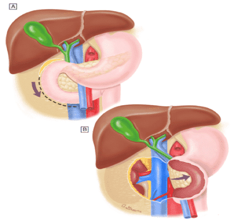 Figure 2. Kocher Maneuver. A) exposes first, second and third portion of the duodenum and the head and neck of the pancreas (B). Adapted from UpToDate, Inc 2022, Graphic 58768 Version 2.0