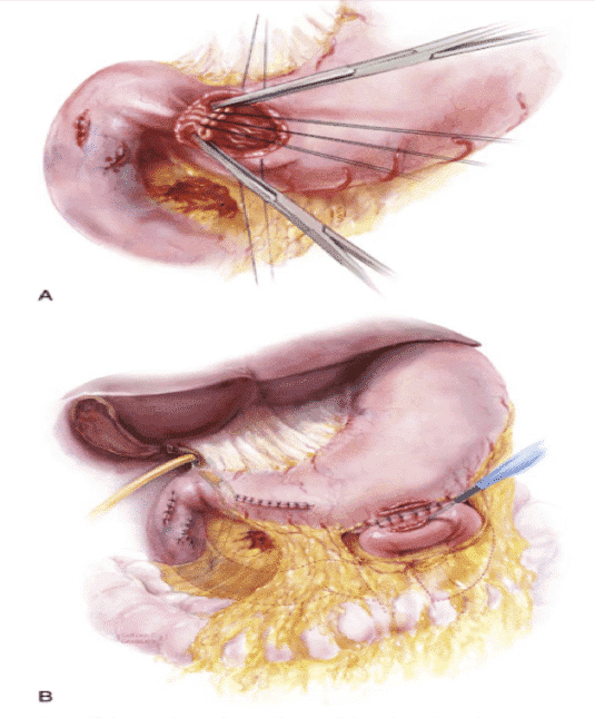 Figure 5. Pyloric Exclusion. Suture closure of the pylorus through a gastrostomy (A) and enteral diversion with a gastrojejunostomy (B).