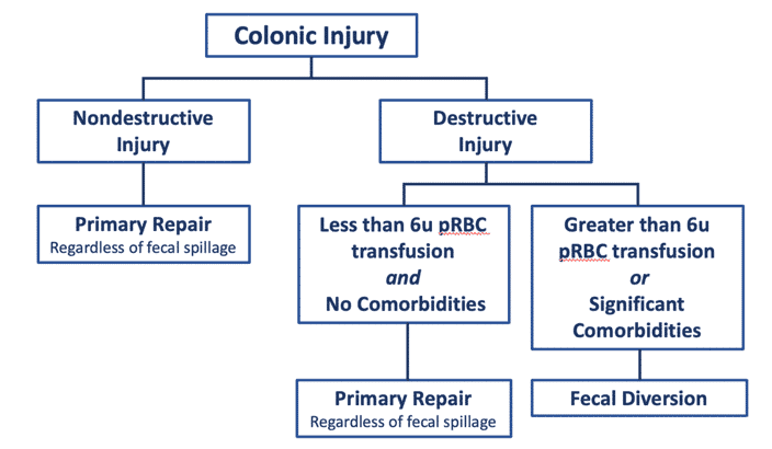 For individuals who have significant comorbidities or who have received 6 or more units pRBC, fecal diversion or exteriorization of injury is recommended, though resection and anastomosis may be appropriate in select patients pending clinical appearance per EAST guidelines [16]. Notably, fecal contamination is not a determining factor in definitive surgical management. [3]