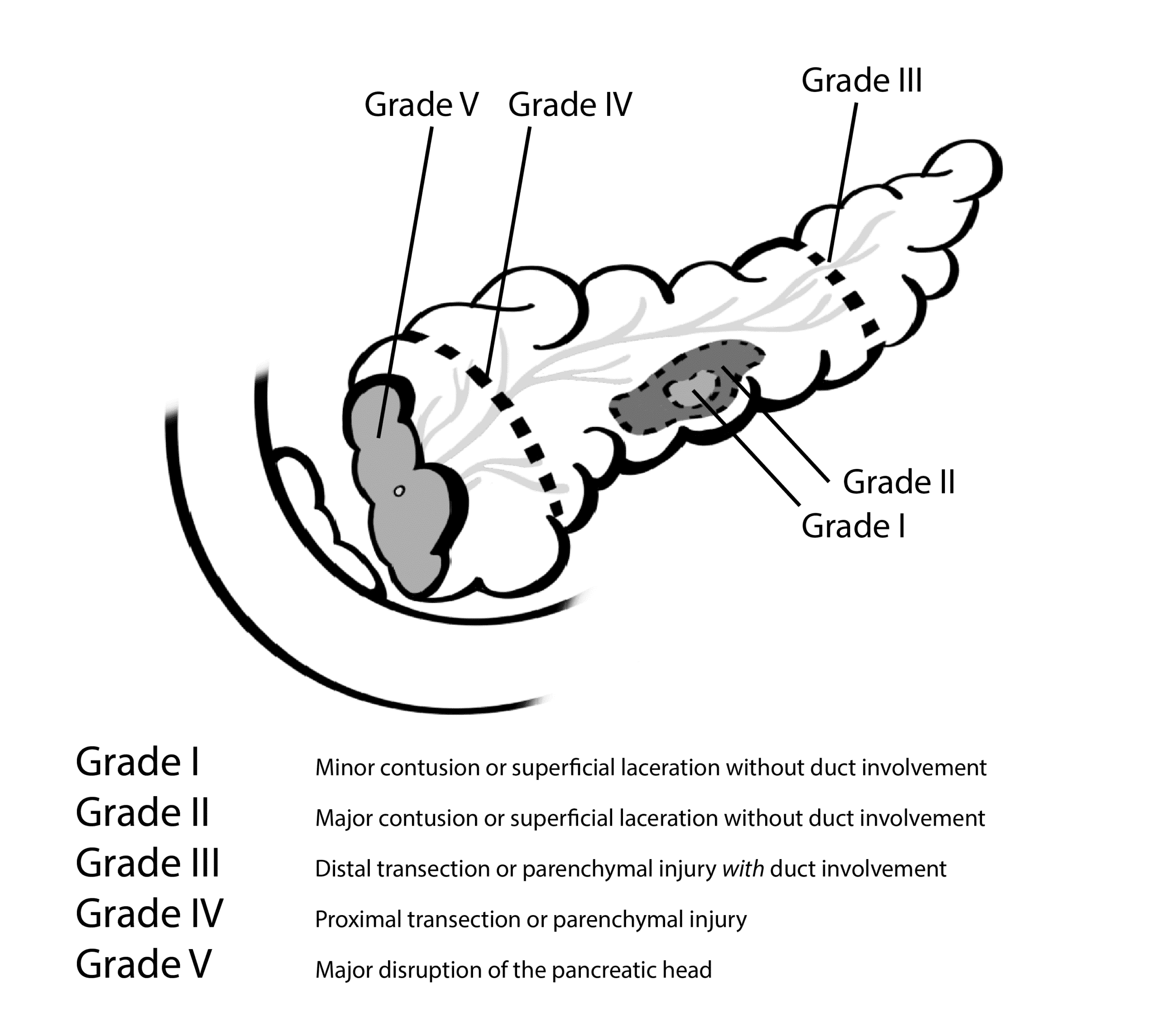 One of the challenges of pancreatic injuries lies in the complexity of its anatomy and relationship to surrounding structures. The head of the pancreas is closely associated with the C-loop of the duodenum and their shared blood supply.[4]