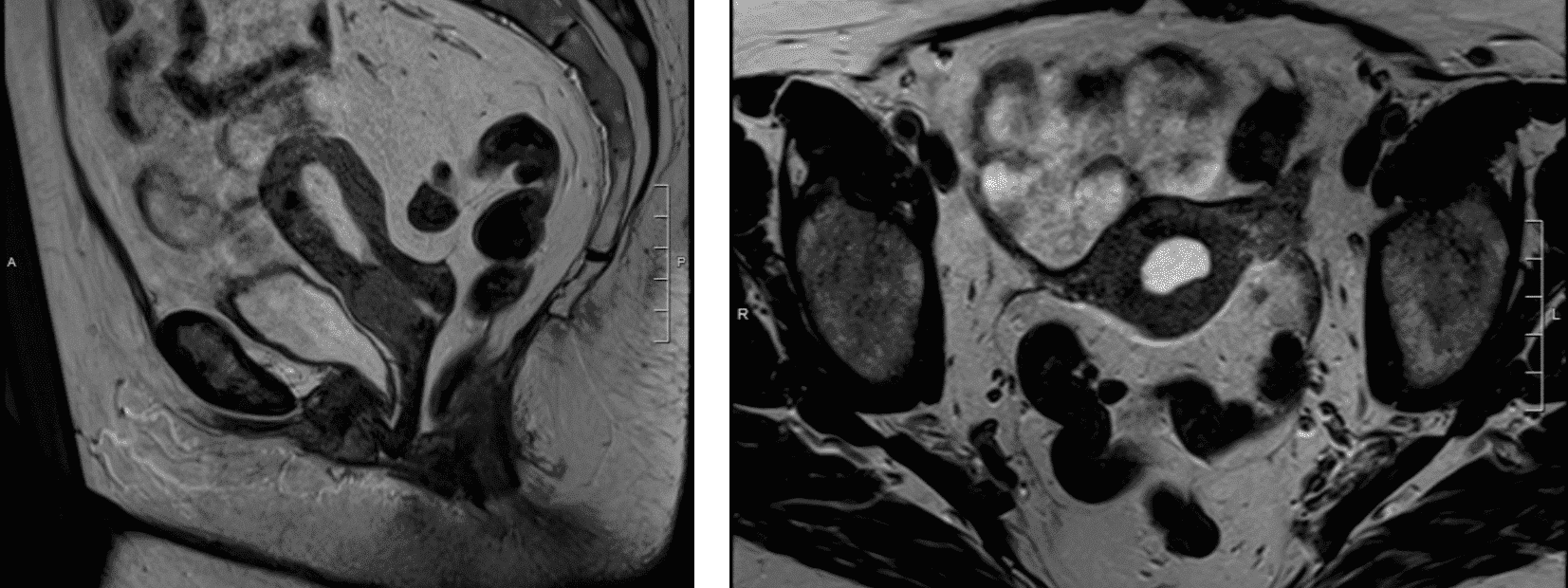 The use of imaging allows for correlation of clinical findings with respect to tumor size and locoregional extension. Furthermore, it allows for evaluation of lymph node metastases. When the prior FIGO staging system, which is based on clinical evaluation only, was compared to operative staging, it was found that patients were understaged in 30%, 25%, and 40% for stage IB, IIB, and IIIB respectively [69]. The ability of MRI and CT to identify lymph node involvement was reported to be 37% and 31%, respectively [70]. Clinical staging had worse sensitivity (29%) than CT (42%) and MRI (53%) for advanced stage disease, which prompted the inclusion of imaging with the most recent FIGO staging. Imaging studies may include chest x-ray, intravenous pyelography, cystoscopy, sigmoidoscopy, barium enema, computed tomography scan, positron emission tomography and magnetic resonance imaging. While MRI and CT are similar in their ability to identify lymph node metastases, MRI is superior in assessing tumor size and parametrial extension (Figure 2) [71, 72]. PET has been shown to be more sensitive (75%) and specific (92%) for para-aortic nodal involvement, which portends a poorer prognosis and overall survival [73-75].