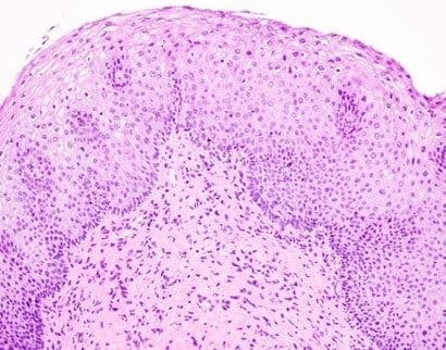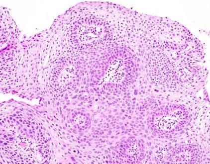 A Ki67 immunostain is typically briskly positive throughout the epithelial thickness. Strong diffuse p16 positivity (particularly in the lower epithelial layers, but often throughout the full epithelial thickness) is characteristic of HSIL and has a high negative predictive value in distinction of HSIL from reactive epithelial atypia or LSIL.